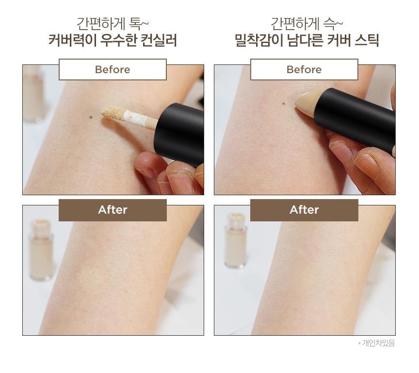 - Tại những vùng da có khuyết điểm, sử dụng đầu son thỏi để che phủ khuyết điểm có diện tích nhỏ, sử dụng đầu cọ lỏng để che phủ khuyết điểm có diện tích lớn, tán nhẹ sao cho lớp kem dàn trải đều trên da.