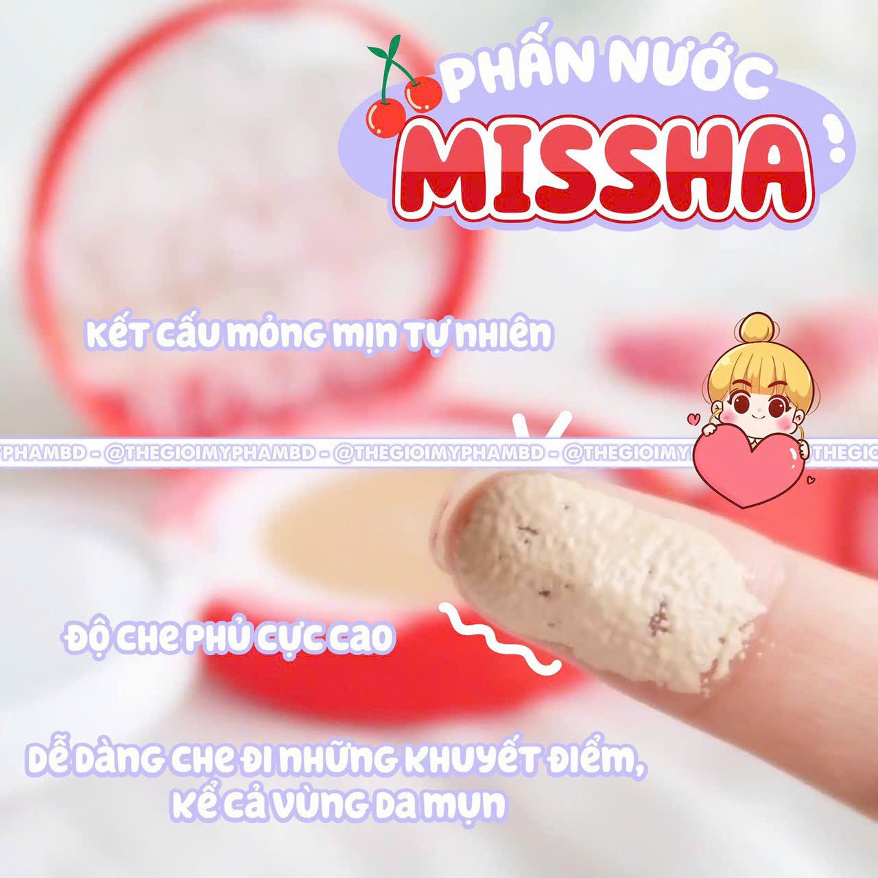 Phấn Nước Missha velvet Finish có công thức cho kết cấu nền mỏng nhẹ tự nhiên. Không gây nặng mặt khi sử dụng.