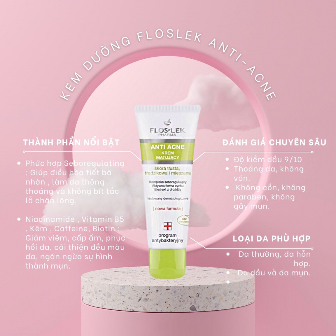- Kem Kiểm Sót Dầu Và Điều Tiết Nhờn Floslek Anti Acne Mattifying Cream điều tiết bã nhờn, làm dịu làn da bị tổn thương do mụn