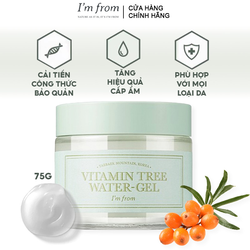 Gel Dưỡng I'm From Vitamin Tree Water Gel là dòng kem dưỡng dạng gel, với chiết xuất thành phần chính là lá Hắc Mai Biển, Niacinamide giúp dưỡng trắng da hiệu quả, dưỡng ẩm cho da luôn mềm mại, bảo vệ da khỏi các tác nhân bên ngoài môi trường thuộc thương hiệu mỹ phẩm I'm From đến từ Hàn Quốc.