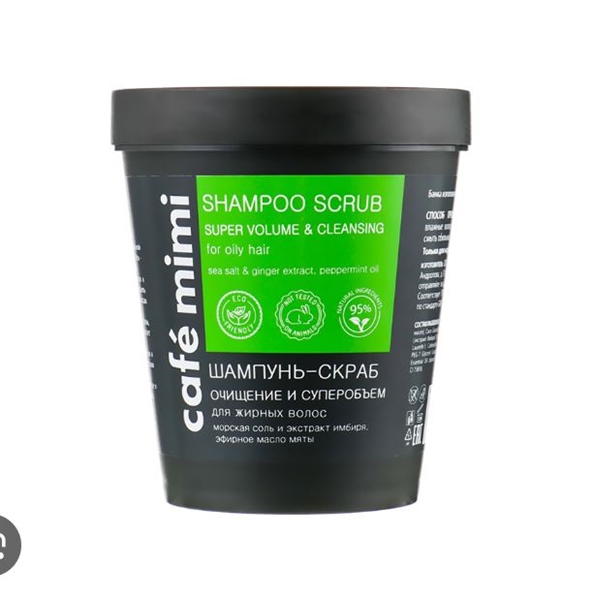 Tẩy tế bào chết da đầu dầu Cafe Mimi Cleansing & Super Volume Shampoo Scrub chứa hơn 50% muối biển tự nhiên, chiết xuất gừng và tinh dầu bạc hà là một sản phẩm chăm sóc và detox cho tóc và da đầu làm sạch sâu, hỗ trợ loại bỏ tình trạng gàu, nấm, kích thích mọc tóc, phục hồi và giúp tóc chắc khoẻ.