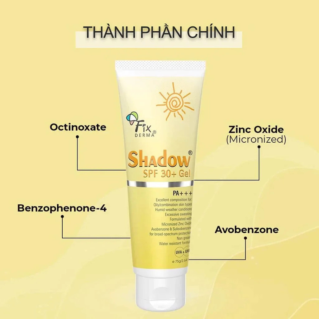 Kem Chống Nắng Fixderma Shadow SPF30 PA +++ ( Dạng Gel ) với chỉ số chỉ nắng SPF30+ và sự kết hợp giữa màng lọc vật lý và hóa học giúp nâng cao khả năng bảo vệ da trước các tia gây hại từ ánh nắng mặt trời. Đồng thời sản phẩm còn có tính cấp ẩm cao, giúp giảm tình trạng tiết dầu, bóng nhờn trên da hạn chế hình thành mụn. Với kết cấu dạng gel mỏng nhẹ phù hợp với mọi loại da, đặc biệt da dầu, mụn, nhạy cảm.