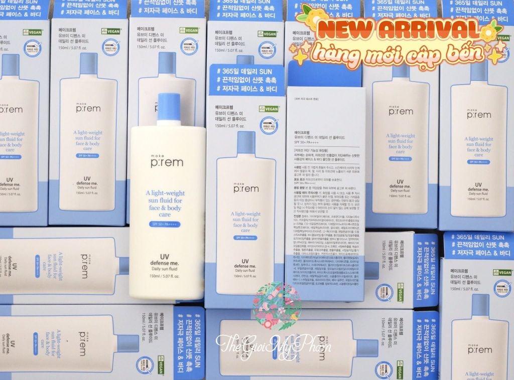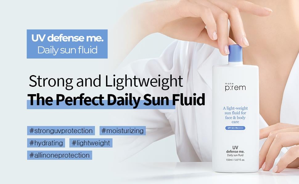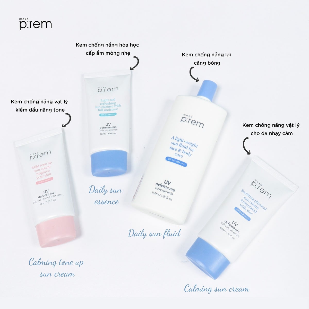 Kem chống nắng Make P:rem UV Defense Me. Daily Sun Fluid kết hợp giữa màng lọc vô cơ và hữu cơ, giúp bảo vệ toàn diện cho da mặt và cơ thể tránh khỏi tác hại của tia UVA / UVB.