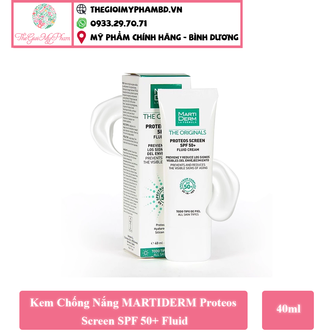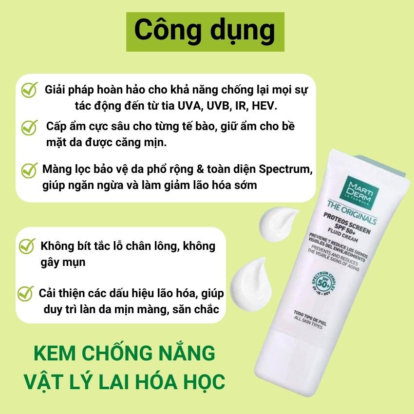 Kem Chống Nắng MARTIDERM Proteos Screen SPF 50+ Fluid là kem chống nắng dạng lỏng dễ hấp thụ với chỉ số SPF 50+ giúp ngăn ngừa và sửa chữa các dấu hiệu lão hóa da sớm. Sản phẩm cung cấp màng lọc chống nắng phổ rộng chống lại các tia UVA, UVB, IR (hồng ngoại), HEV (ánh sáng xanh).