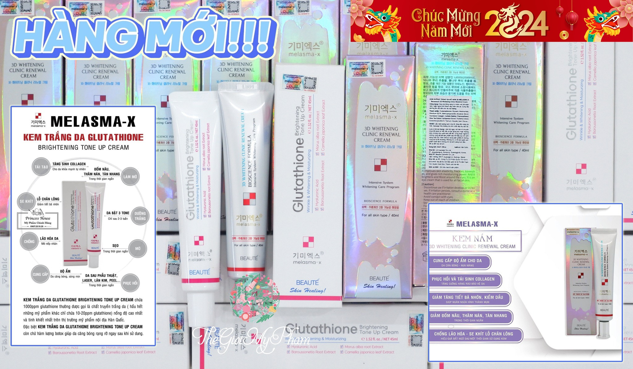 Kem Dưỡng Melasma-x Glutathione là một sản phẩm thuộc thương hiệu nội địa tại Hàn Quốc chứa các thành phần giàu chất chống oxy hóa mang lại hiệu quả dưỡng trắng cũng như cải thiện nếp nhăn hiệu quả từ sâu bên trong.