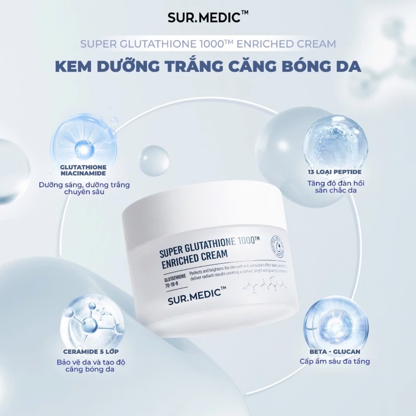 Kem Dưỡng Sur.Medic Super Glutathione 1000TM Enriched Cream Dưỡng Trắng Da với thành phần chứa Glutathione và Niacinamide giúp dưỡng sáng da chuyên sâu, mang lại làn da sáng mịn, đều màu.