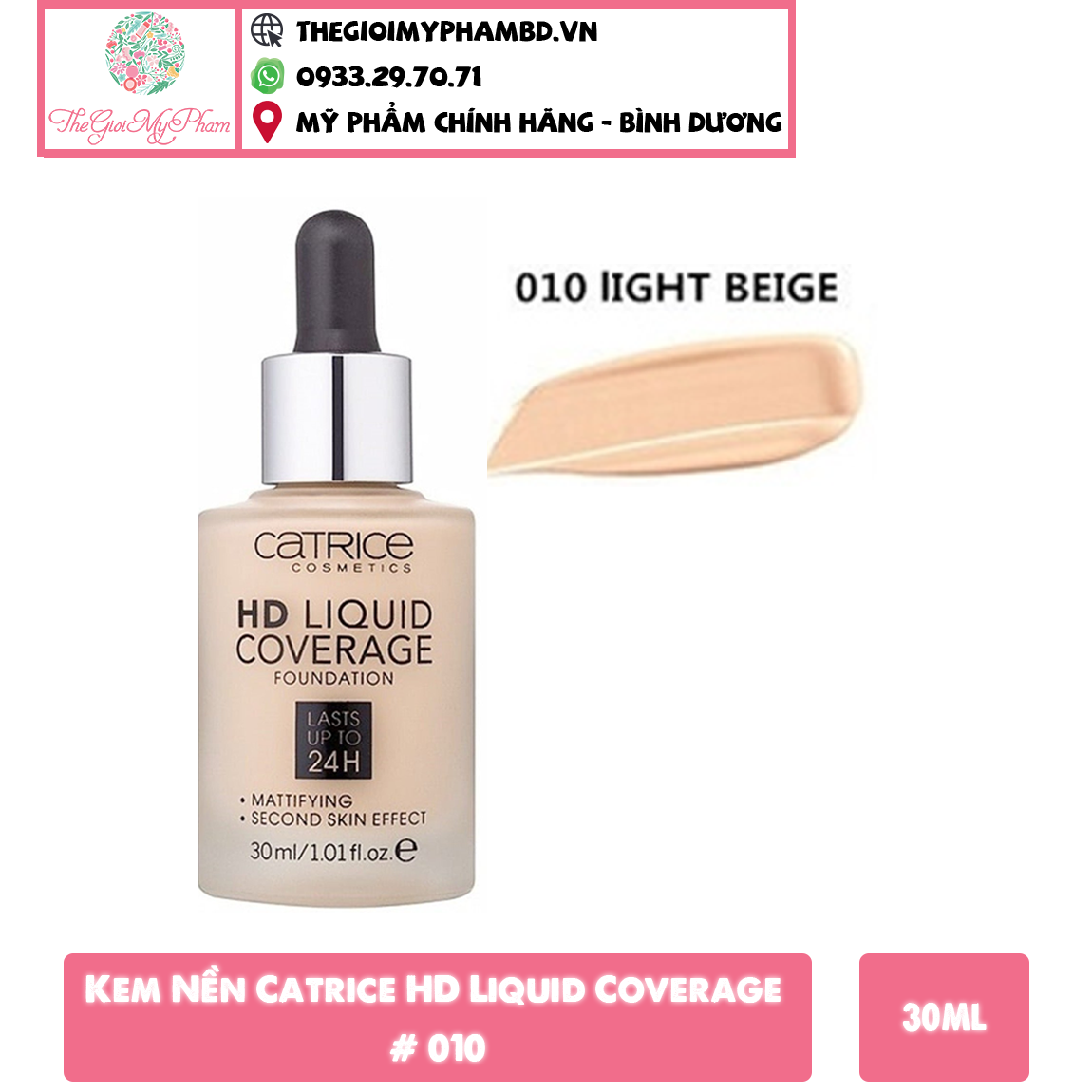 Kem Nền Catrice HD Liquid Coverage Foundation tạo một lớp nền mỏng, đều màu, trong suốt. Không chỉ là sản phẩm trang điểm mà kem còn có tác dụng như một loại kem dưỡng. Một nghiên cứu về da liễu cho thấy chỉ sau 8 tuần sử dụng hàng ngày, các đốm sẫm màu có thể sáng lên trông thấy, ngăn ngừa sự ửng đỏ trên da.