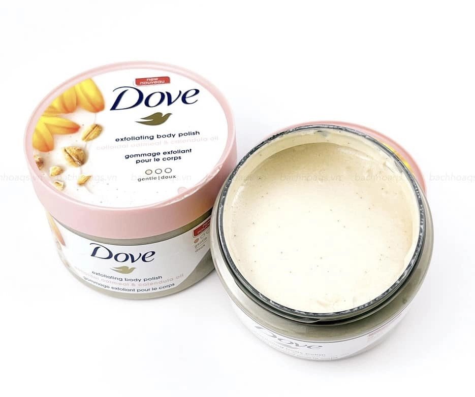 - Tẩy da chết Dove có công dụng tẩy da chết vừa phải, ko làm đau rát da. Được làm từ các hạt có kích thước bằng cát biển mịn màng, dễ tán, tạo bọt nhẹ.