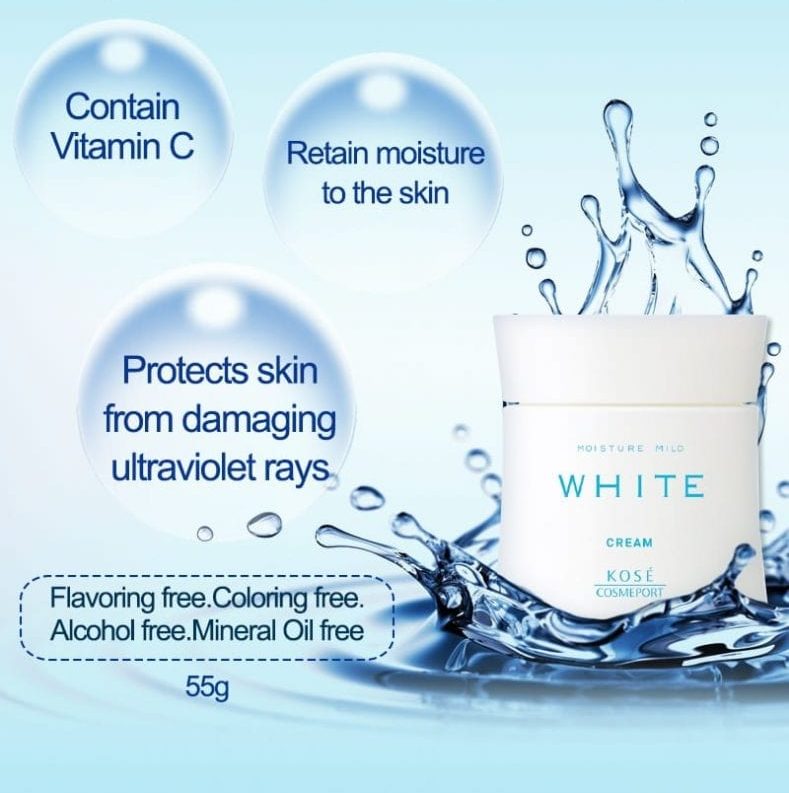 Kem Dưỡng Trắng Da Kose Moisture Mild White với thương hiệu Kose từ Nhật Bản, là dòng kem dưỡng da cấp nước cực nhanh, với hàm lượng vitamin C cao, kem có khả năng thấm sâu, tạo cho da có sự đàn hồi tốt. Đồng thời kem có tác động loại bỏ các vết nám, sạm da, cùng các đốm nâu, tàn nhang.