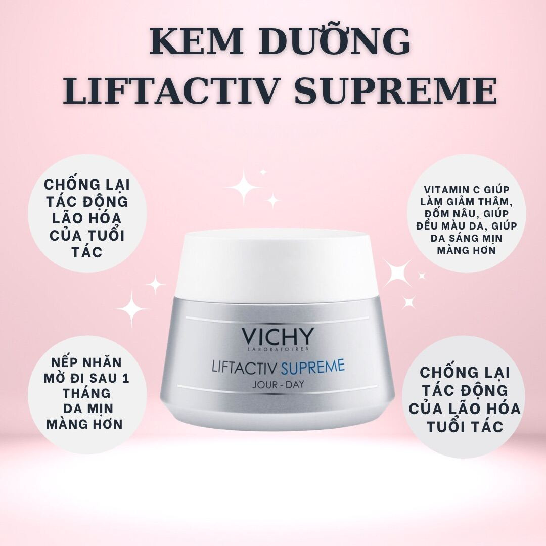 Kem dưỡng làm chậm quá trình & ngăn ngừa lão hóa da ban ngày Vichy Liftactiv Supreme Day Cream 50ml giúp giảm những dấu hiệu lão hóa dễ nhận thấy như: da xỉn màu, các vết nhăn ở vùng trán, vết chân chim ở gần khóe mắt và những dấu hiệu lão hóa khác. Sau 1 tháng sử dụng, nếp nhăn mờ dần 74% đồng thời giúp da săn chắc hơn, trả lại cho bạn làn da mịn màng, tươi sáng.'