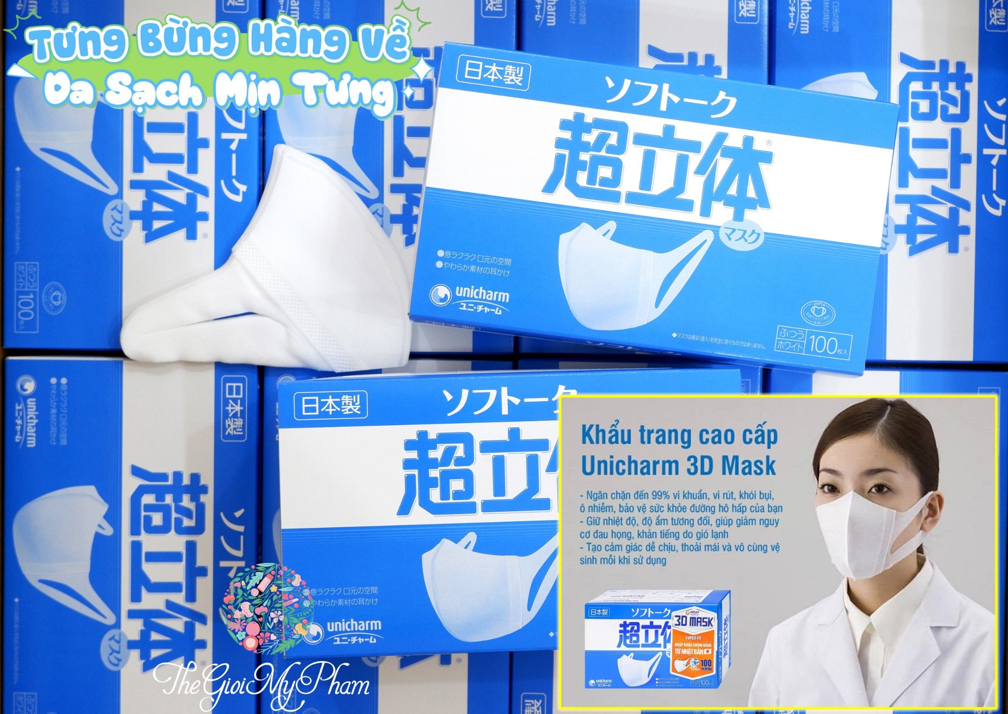 Khẩu trang Unicharm 3D Mask hộp 100 cái của Nhật được ưa chuộng nhất hiện nay. Sản phẩm chống khói bụi, ô nhiễm, hỗ trợ hệ hô hấp hoạt động tốt.