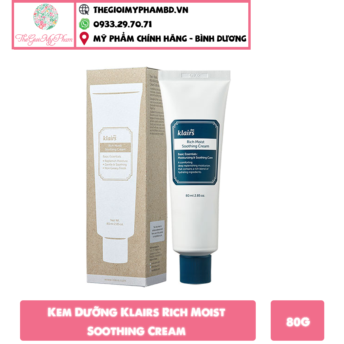 Kem Dưỡng Klairs Rich Moist Soothing Cream là kem dưỡng bao gồm thành phần Beta-Glucan kết hợp cùng các chất dinh dưỡng đến từ thiên nhiên cấp nước cho làn da ẩm mịn, làm dịu da và xóa mờ những vết thâm do mụn. Bên cạnh đó, giúp tăng cường sức mạnh hàng rào bảo vệ làn da nhạy cảm trở nên khỏe mạnh tràn đầy sức sống