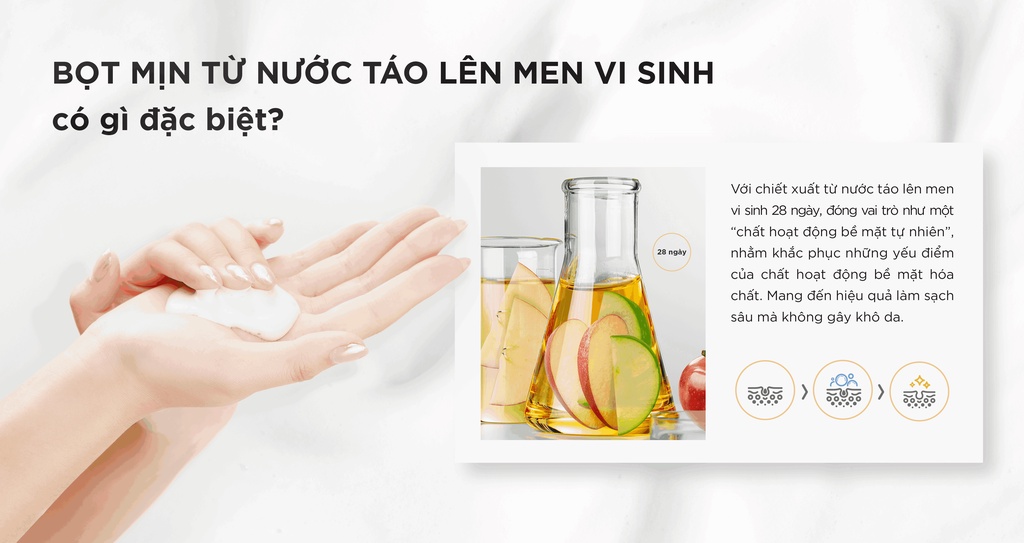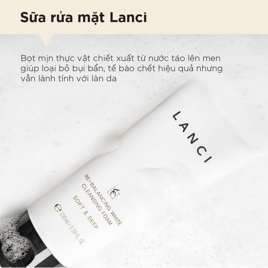 Sữa rửa mặt Lanci Re-Balancing White Cleansing Foam áp dụng công nghệ tạo bọt tăng cường tạo nên hàng ngàn bọt khí li ti từ nước táo lên men tự nhiên trong 28 ngày, từ đó đi sâu vào lỗ chân lông, làm sạch da, giúp loại bỏ bụi bẩn, bã nhờn, mang lại làn da sáng mịn sau khi sử dụng nhưng vẫn giữ được độ ẩm cho da.