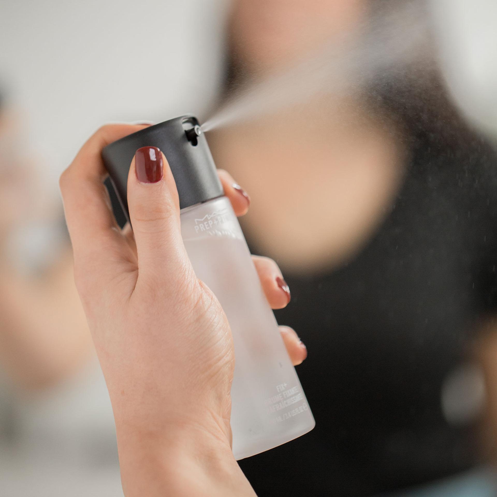 Cách 1: Đặt Xịt Khoáng Cố Định Lớp Trang Điểm MAC Không Mùi 100ml cách mặt từ 20-30cm, sau đó xịt đều lên mặt theo vòng tròn để hoàn thành lớp trang điểm.