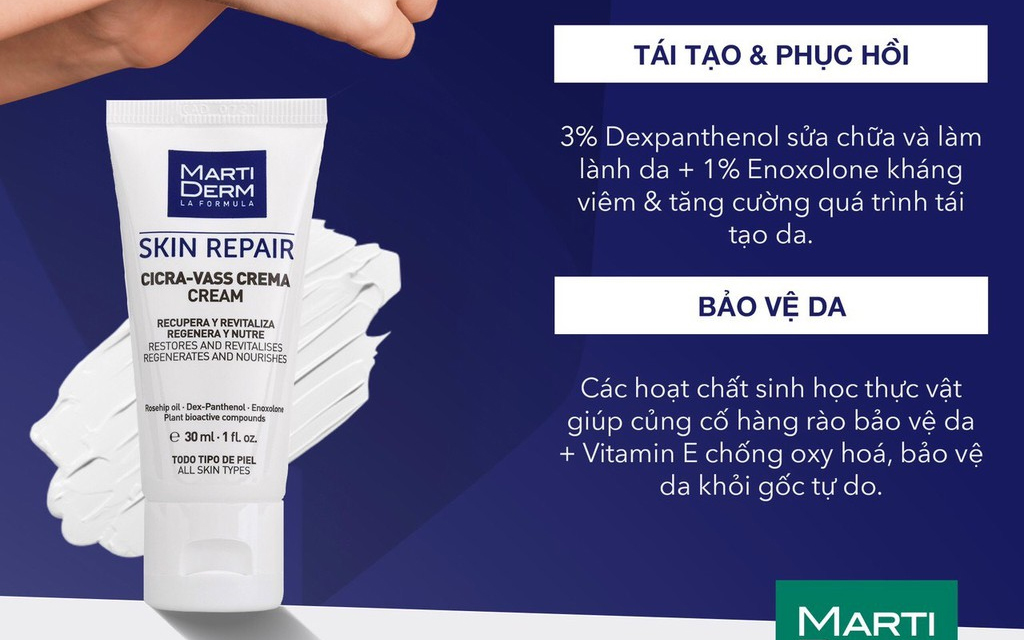 Kem Dưỡng Tái Tạo & Phục Hồi MartiDerm Skin Repair Cicra Vass Cream là kem dưỡng hỗ trợ những làn da nhạy cảm hoặc da đang tổn thương tái tạo và phục hồi nhanh hơn. Với các thành phần hoạt tính được chiết xuất từ thực vật, sản phẩm giúp làm dịu cảm giác đau rát khó chịu; hỗ trợ làm lành các dấu hiệu kích ứng trên da như ửng đỏ; ngăn ngừa nguy cơ hình thành sẹo sau viêm; nuôi dưỡng lớp màng ẩm tự nhiên bảo vệ da, cho da khỏe mạnh, mềm mại hơn; đồng thời tăng cường độ đàn hồi và săn chắc.