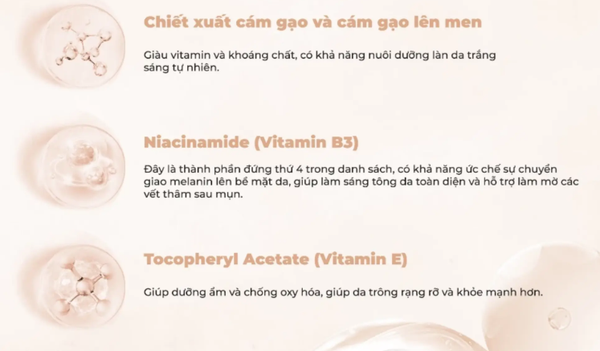 • Cám gạo lên men: Giúp da trông rạng rỡ và đều màu hơn.