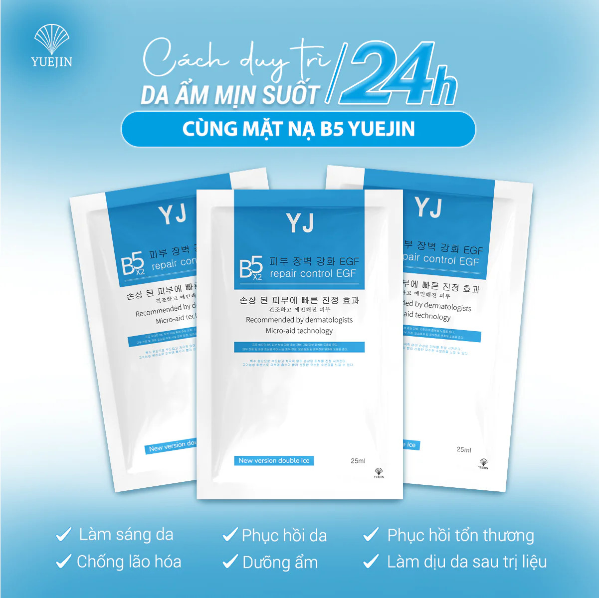 Mặt Nạ Phục Hồi Cấp Ẩm Cho Da Yuejin B5 là một trong những loại mặt nạ dưỡng ẩm phục hồi da, giúp làm dịu da và giảm kích ứng da, đồng thời tái tế bào da mới, giúp da phục hồi nhanh giúp da khỏe mạnh, mịn màng hơn. Nạ có khả năng làm dịu da, tái tạo và phục hồi da tổn thương nhanh chóng sau liệu trình lăn kim, phi kim, laser, peel da,…