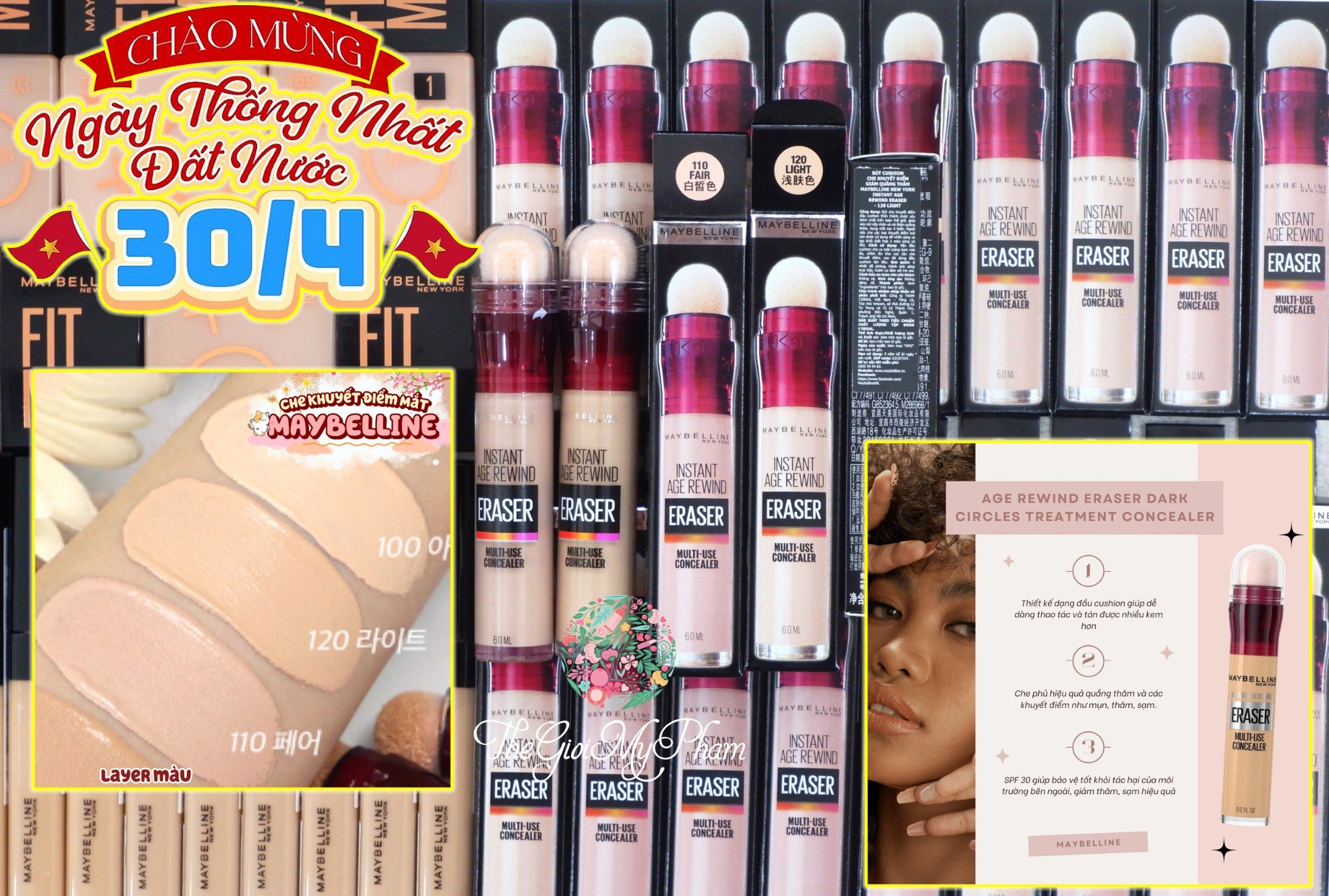 Che Khuyết Điểm Maybelline Instant Age Rewind Treatment Concealer là kem che khuyết điểm dành cho vùng dưới mắt với thành phần có chứa Haloxyl có khả năng che phủ quầng thâm và bọng mắt một cách hiệu quả, đồng thời tạo sức sống cho gương mặt. Bên cạnh đó, sản phẩm còn đồng thời là “concealer treatment”, nếu bạn sử dụng liên tục trong thời gian dài, em ấy còn khiến cho vùng thâm & bọng mắt trở nên sáng màu, các nếp nhăn nhẹ li ti sẽ mờ đi đáng kể.