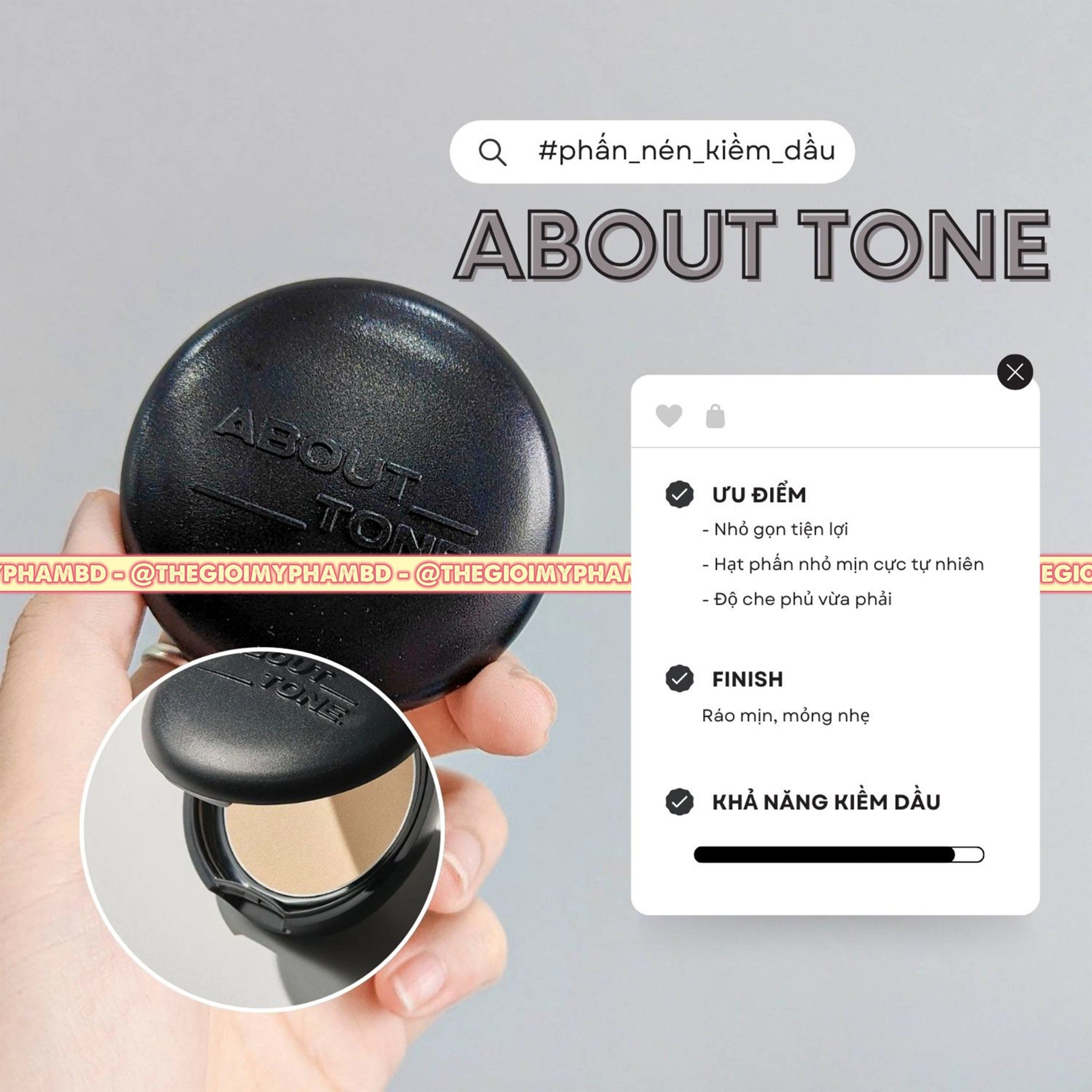 Với thời tiết nắng nóng như Việt Nam, phấn phủ là một sản phẩm không thể thiếu giúp các nàng duy trì lớp make up mị màng không bị bóng dầu. Phấn phủ kiềm dầu sẽ giúp các nàng xua tan nỗi lo về khuôn mặt bóng dầu khi trang điểm. Với khả năng kiềm dầu đỉnh cao đồng thời nâng tone nhẹ nhàng, Phấn Phủ About Tone Blur Effect hứa hẹn sẽ là sản phẩm Best Seller trong thời gian tới trên kệ hàng nhà #TGMP. Chốt đơn ngay một em để không bỏ lỡ sản phẩm siêu hot này nha.