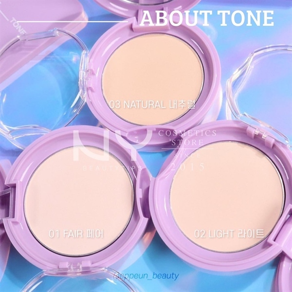 Phấn phủ dạng nén About Tone Raise Your Beauty Tone Purple phiên bản giới hạn có khả năng kiểm soát dầu nhờn, tạo nên 1 lớp nền lì, lâu xuống tone. Khả năng che phủ khá tốt, che lấp những khuyết điểm trên da như vết thâm do mụn để lại, tàn nhang, mang lại một lớp nền hoàn hảo.