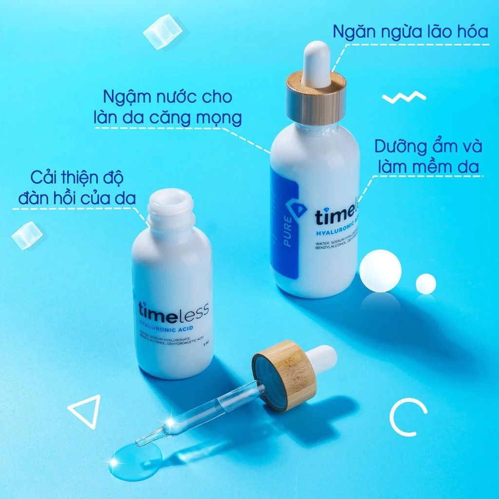 Timeless Hyaluronic Acid Serum 100% Pure là dòng sản phẩm tinh chất dưỡng đến từ thương hiệu Timeless nổi tiếng của Mỹ, chứa 1% Hyaluronic Acid giúp cấp nước và bổ sung độ ẩm cho da căng mọng, mịn màng, cải thiện hiệu quả tình trạng da khô thô ráp, đồng thời hỗ trợ xóa mờ các nếp nhăn nông & nếp nhăn li ti. An toàn cho mọi loại da, kể cả da nhạy cảm.