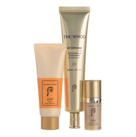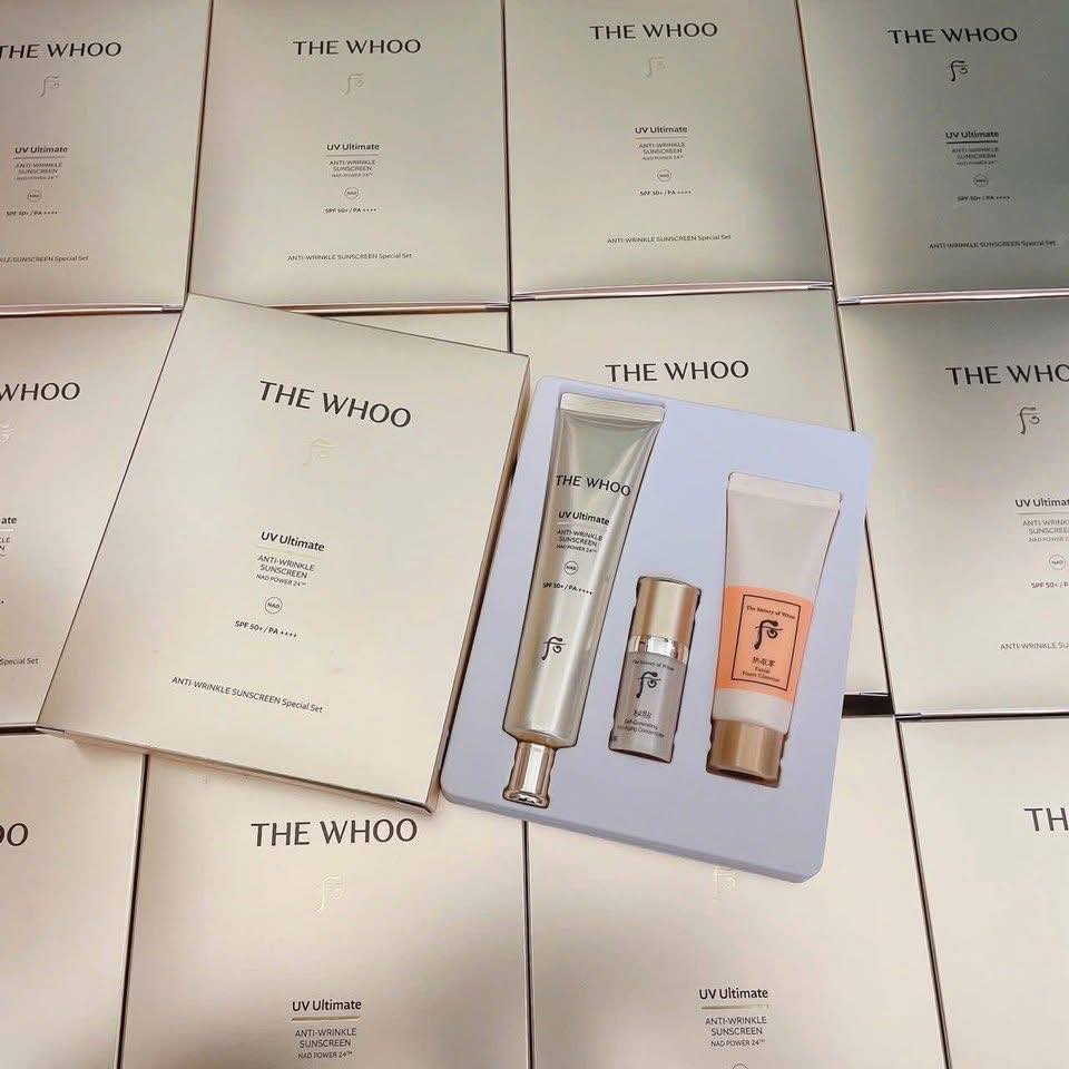 - Kem Chống Nắng The Whoo UV Ultimate Anti Wrinkle Sunscreen Special Set SPF50+ PA++++ bộ sản phẩm gồm 3 món: kem chống nắng, tinh chất dưỡng và sữa dưỡng. Nhờ sự kết hợp này, làn da không chỉ được bảo vệ khỏi tác hại của môi trường và ánh nắng mặt trời mà còn được nuôi dưỡng chuyên sâu, duy trì độ ẩm cân bằng, giảm tình trạng khô ráp và xỉn màu, mang đến vẻ ngoài tươi trẻ và rạng rỡ hơn từng ngày.