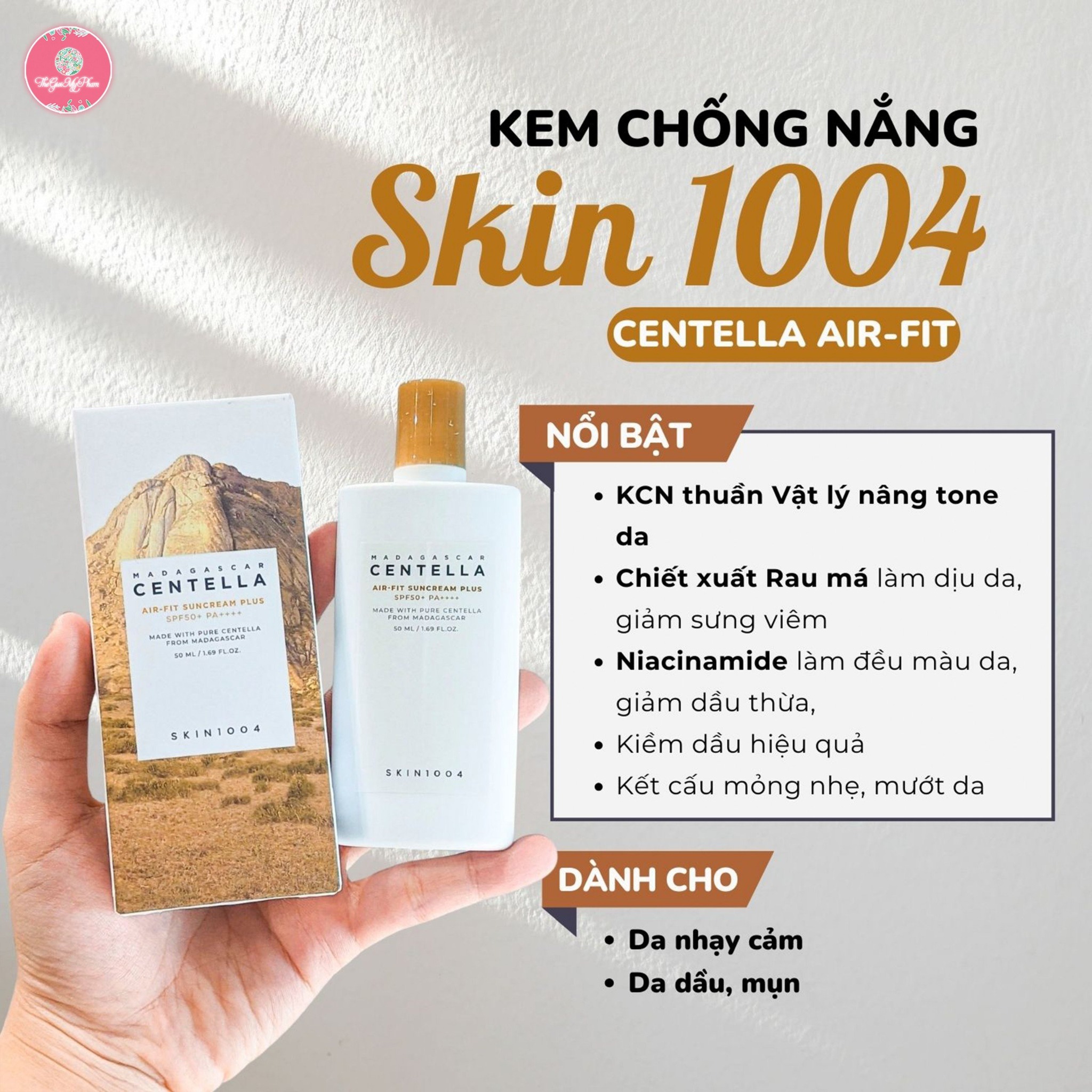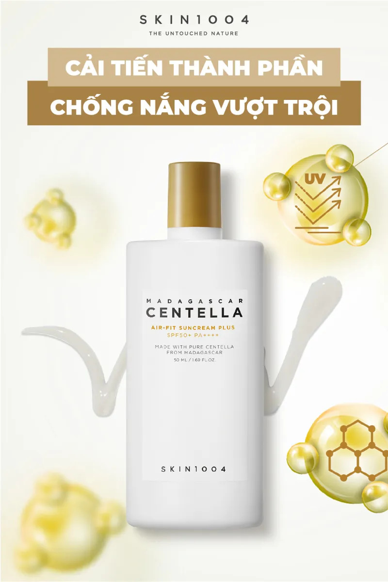 Skin1004 - Madagascar Centella Air-Fit Sun Cream là dòng kem dưỡng đến từ thương hiệu mỹ phẩm Skin1004 của Hàn Quốc, với thành phần chính là rau má từ vùng Madagascar làm giảm tình trạng mụn, hỗ trợ kháng viêm, mụn và làm dịu làn da mụn, tái tạo da mang lại làn da tươi mới.