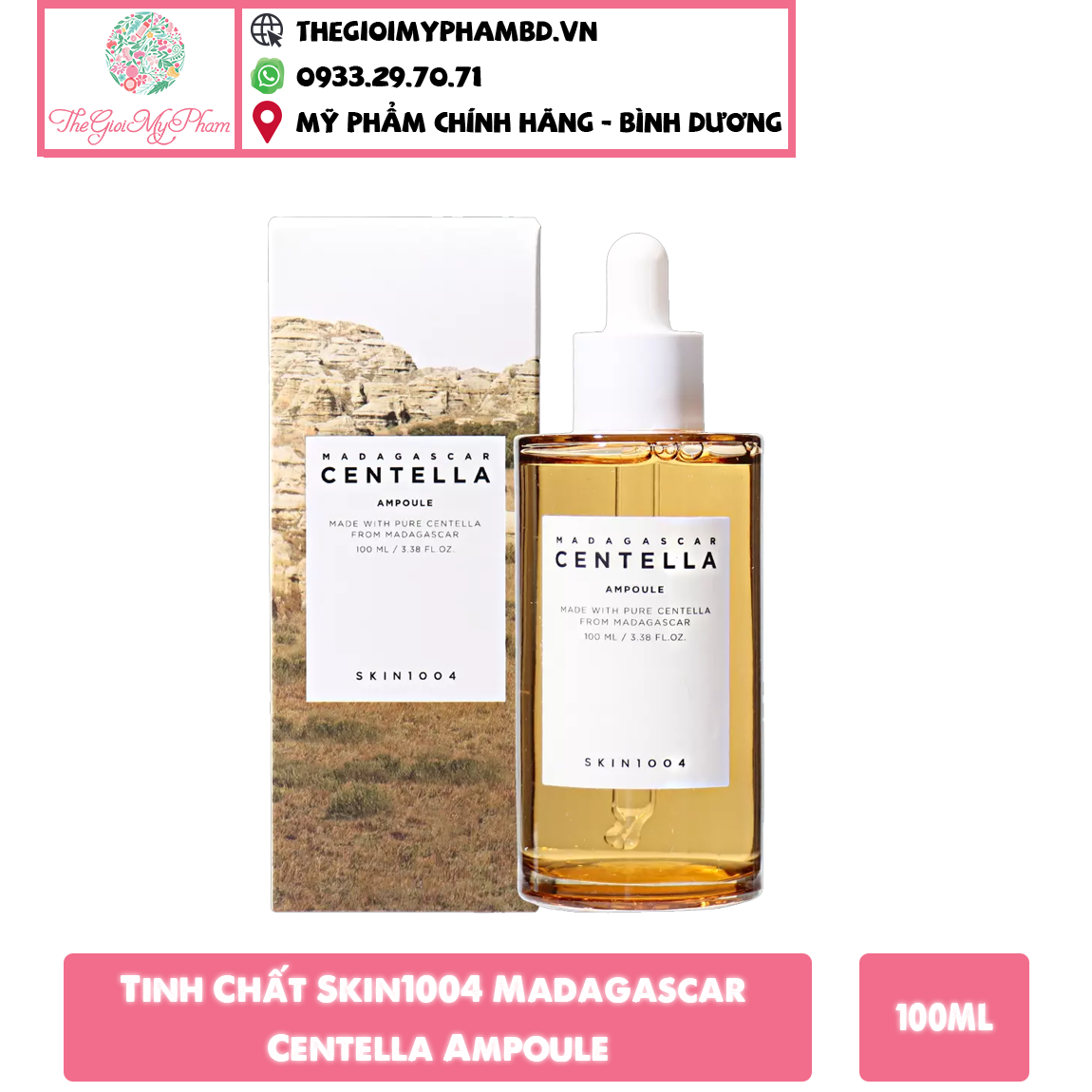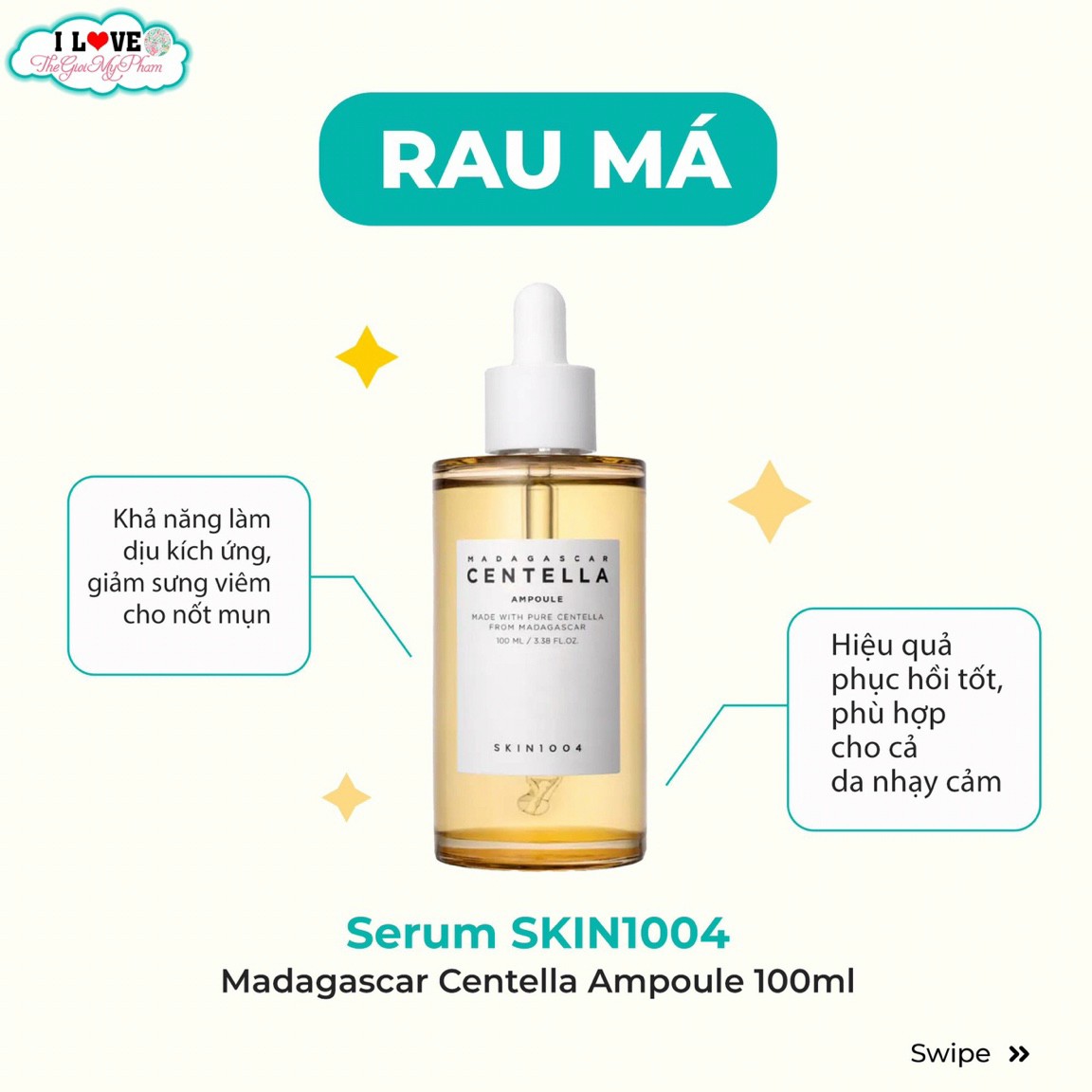 Tinh Chất Giảm Mụn Phục Hồi Da Skin1004 Madagascar Centella Ampoule là dòng kem dưỡng đến từ thương hiệu mỹ phẩm Skin1004 của Hàn Quốc, được làm từ chiết xuất rau má chứa 30% Asiaticoside, 30% Asiatic Acid và 40% Madecassic Acid cho làn da tươi sáng, nuôi dưỡng và phục hồi da.