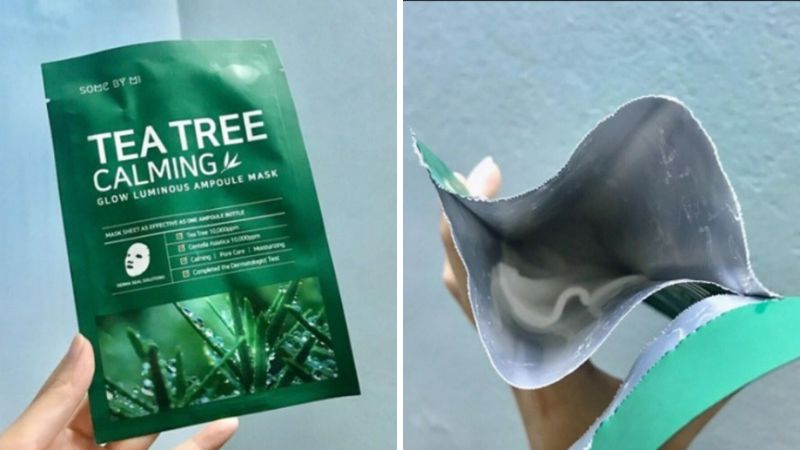 Mặt nạ với thành phần chiết xuất từ lá cây tràm trà chứa hàm lượng 10.000pm, rau má mơ và lá ngải cứu có công dụng làm dịu da hiệu quả, phục hồi làn da tổn thương trở nên khỏe mạnh.