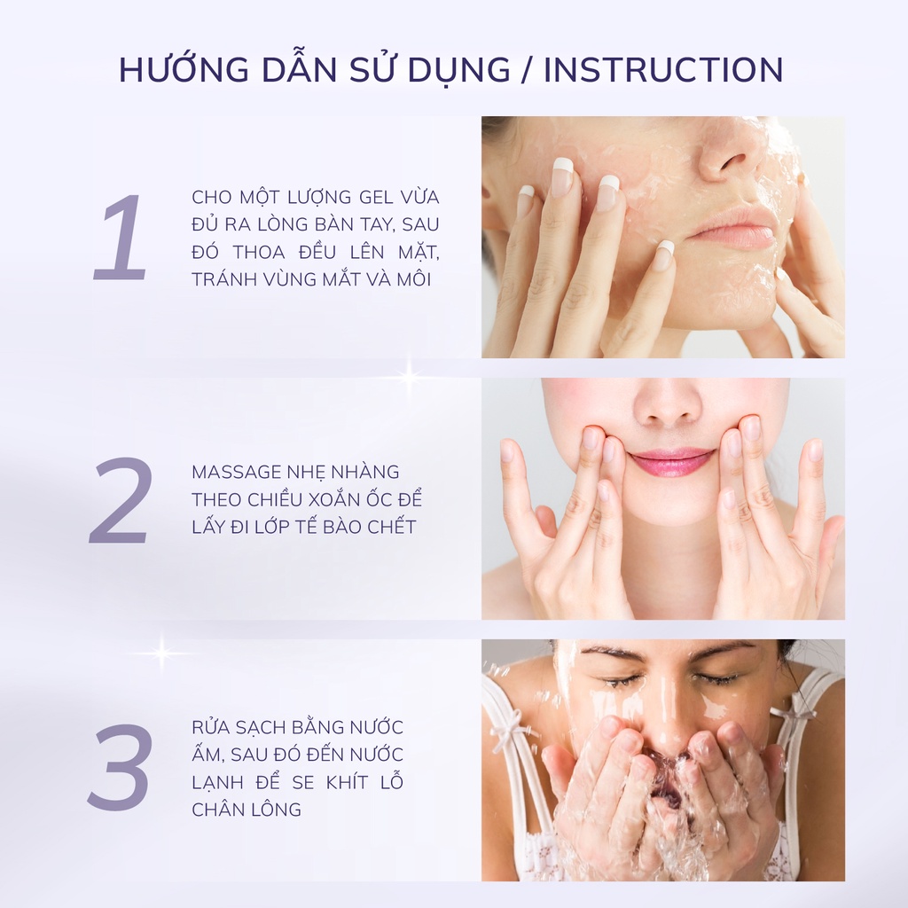 Sau khi rửa mặt, lấy 1 lượng gel vừa đủ thao đều lên mặt khô, tránh vùng mắt và miệng, Nhẹ nhàng mát-xa toàn mặt bằng các ngón tay, sau đó rửa lại với nước ấm.
