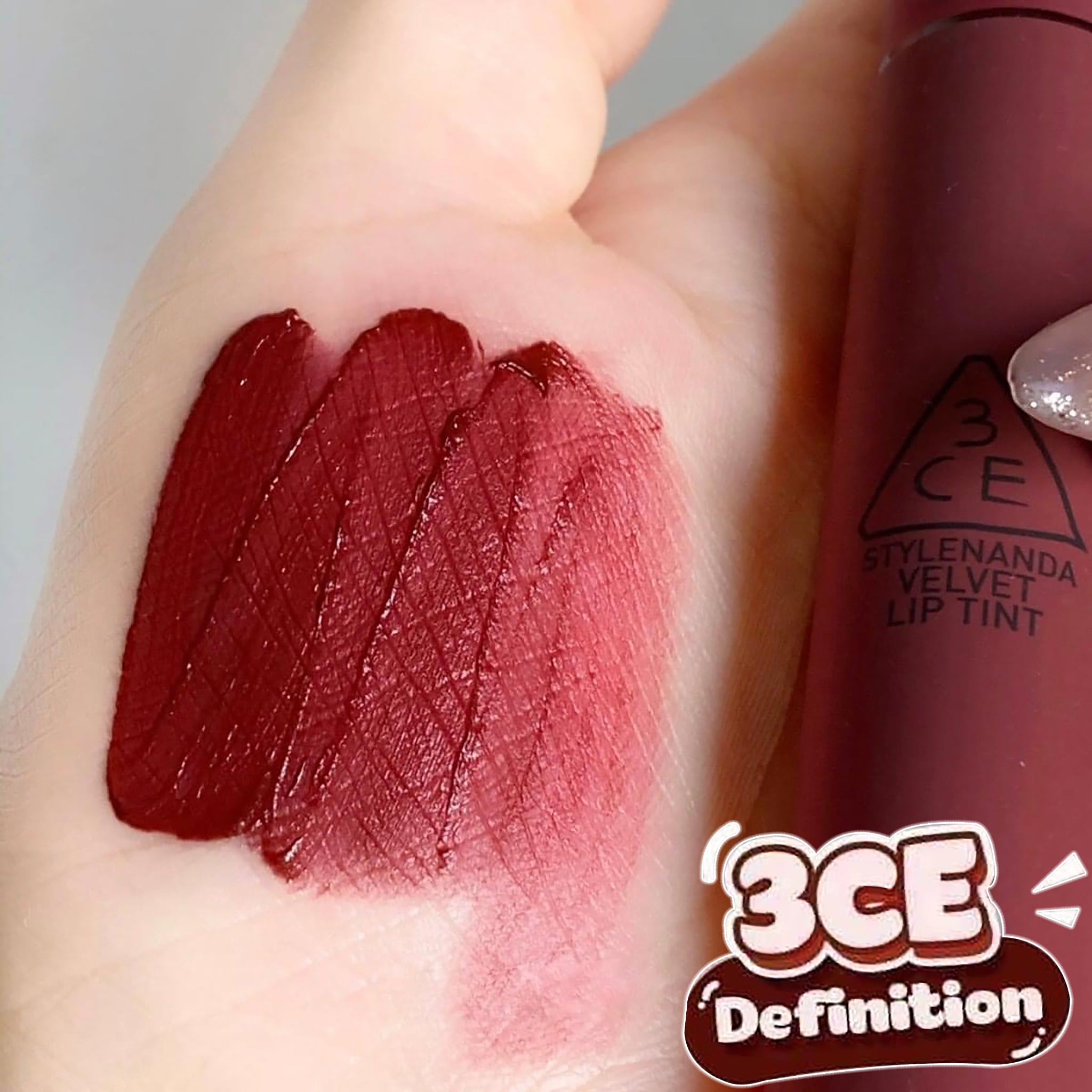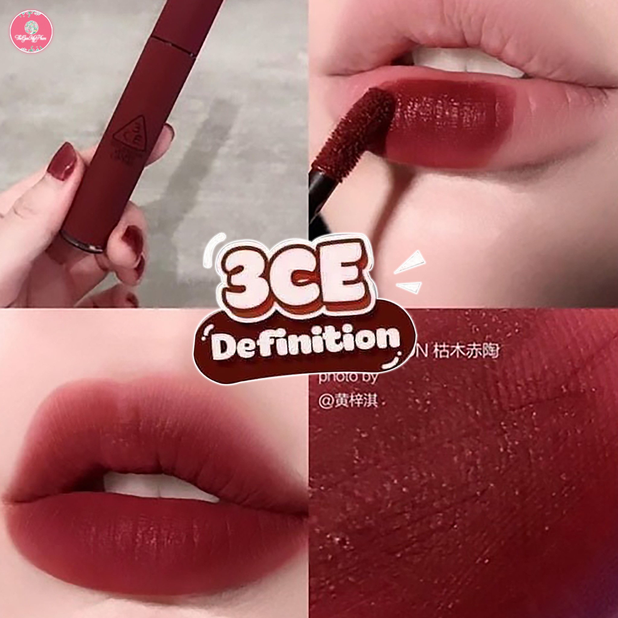 - Sản phẩm son kem lì chủ lực của 3CE Velvet Lip Tint với thiết kế đơn giản nhưng bắt mắt, vỏ son có màu mô phỏng màu son bên trong.