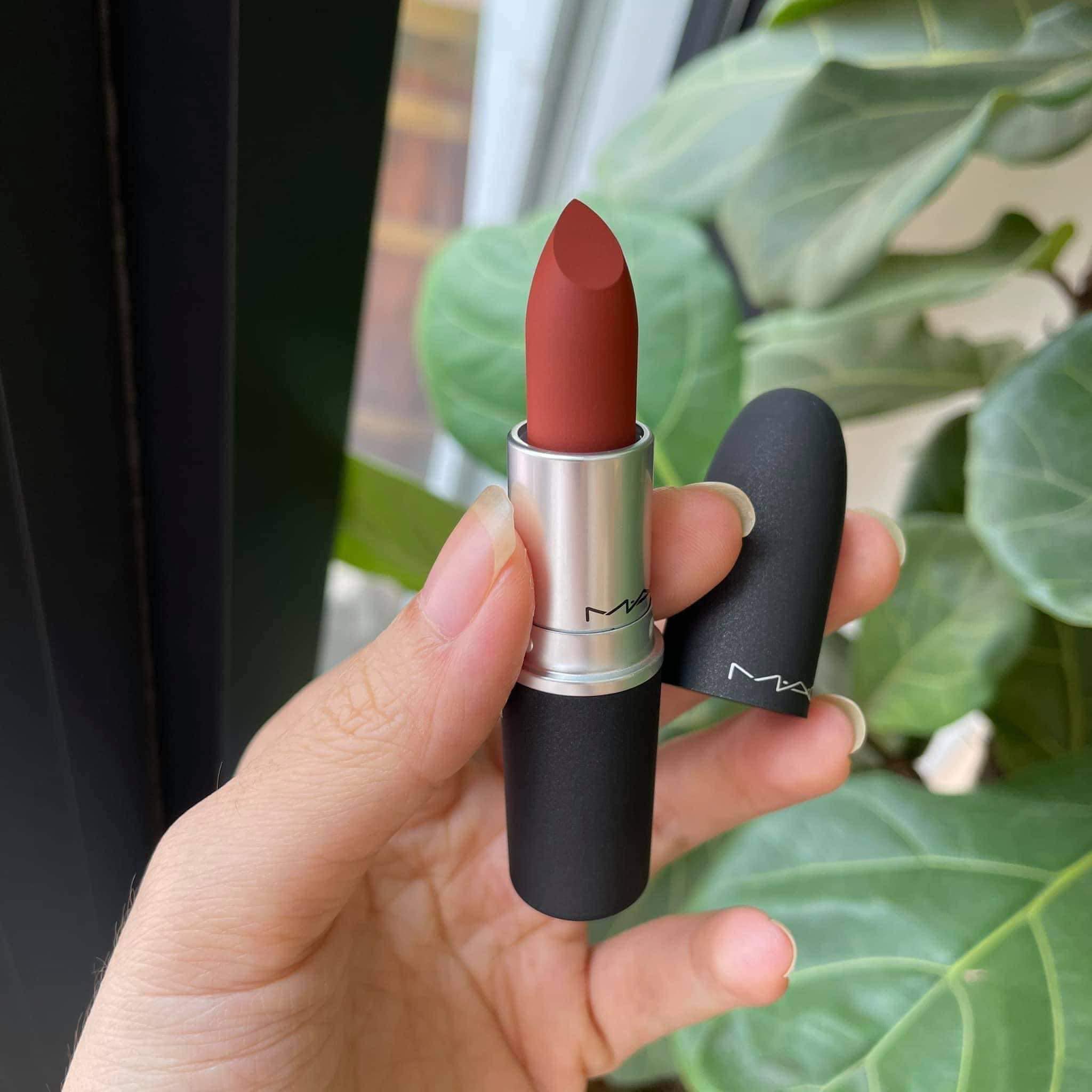 Mac Powder Kiss 925 Marrakesh Mere tông đỏ pha nâu đất nghiêng về tone đất hơn xíu, màu son trendy, đẹp xuất sắc, chất son lì mịn có thể chinh phục ngay cả những cô nàng khó tính nhất