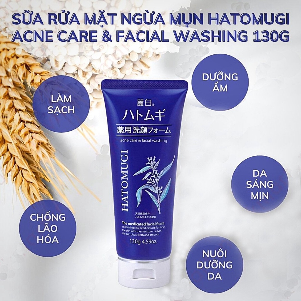 Sữa Rửa Mặt Ngừa Mụn, Sáng Da Acne Care & Facial Washing Nhật Bản giúp làm sạch bụi bẩn, bã nhờn trên da một cách nhẹ nhàng, cấp ẩm sâu cải thiện tình trạng da khô, giúp da đàn hồi tốt hơn, ngăn ngừa mụn, mang lại làn da mềm mại và sáng hồng tự nhiên nhờ chứa chiết xuất hạt ý dĩ cùng các thành phần từ thiên nhiên thuộc thương hiệu Hatomugi đến từ Nhật Bản.