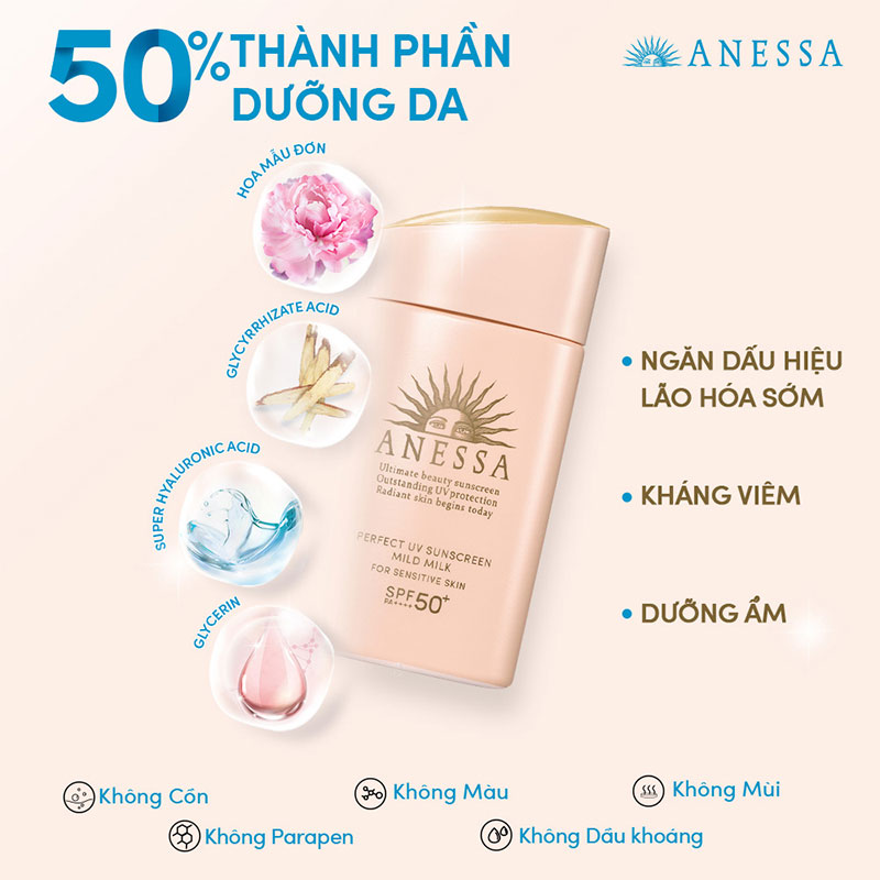 Sữa chống nắng Anessa #Sensitive (Chai Hồng) gúp bảo vệ da tối ưu với kết cấu mỏng nhẹ và thành phần 5 Không (không màu, không mùi, không cồn, không dầu khoáng và không paraben), phù hợp cho cả da nhạy cảm và da trẻ em từ 1 tuổi. Đặc biệt, công thức chứa 50% thành phần dưỡng da giúp bảo vệ da khỏi thương tổn do tia UV và hạt siêu vi trong không khí.