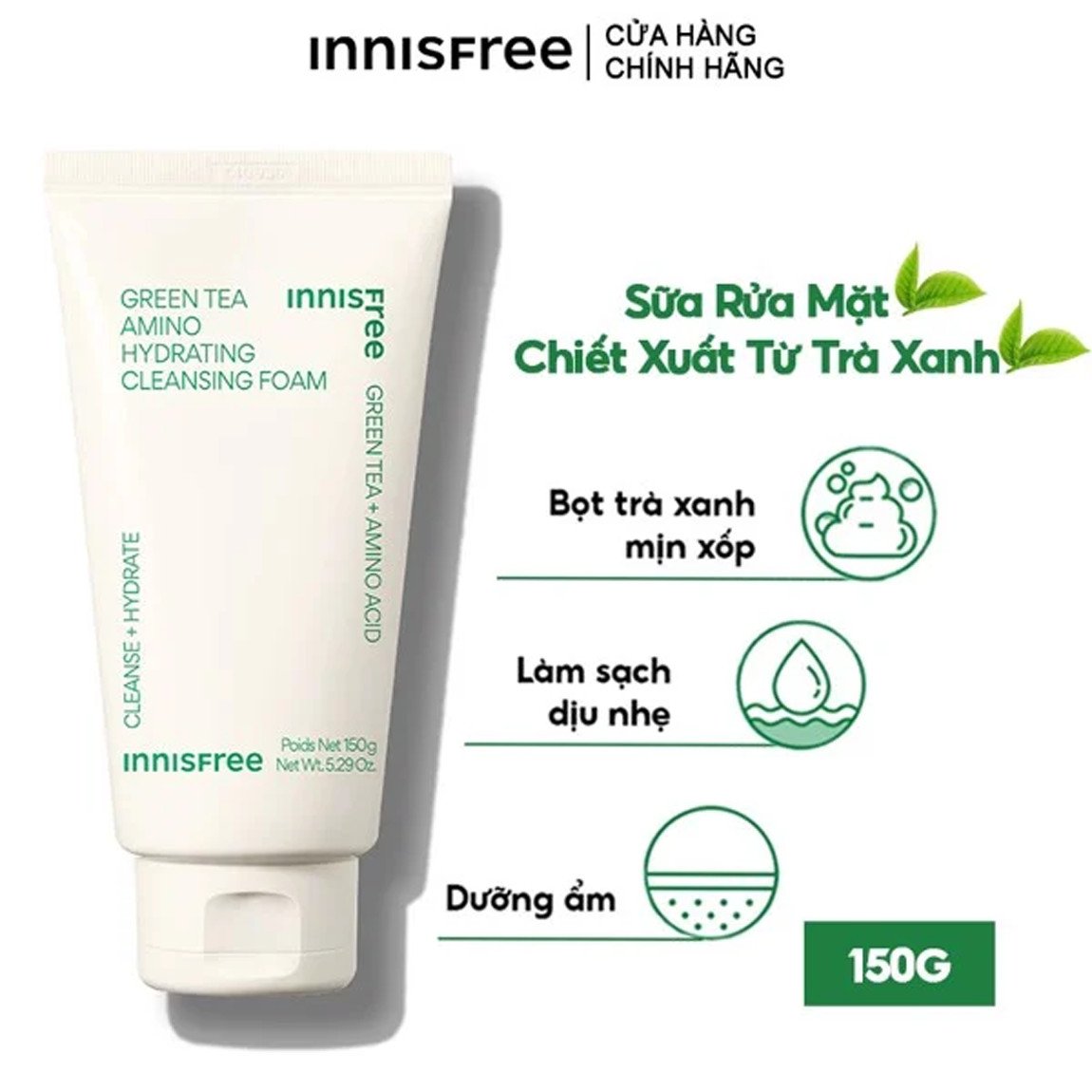 Sữa Rửa Mặt Dưỡng Ẩm Chiết Xuất Từ Trà Xanh Innisfree Green Tea Amino Hydrating Cleansing Foam là sữa rửa mặt trà xanh thuộc thương hiệu Innisfree nổi bật với thành phần chứa 16 loại Amino Acid giàu dưỡng chất giúp làm sạch sâu cùng khả năng phục hồi độ ẩm vượt trôi, đem lại làn da sạch sâu, sáng khỏe.