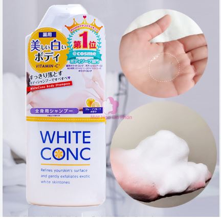 White Conc Body Shampoo with Vitamin C có kết cấu dạng sữa, có khả năng tạo bọt mịn dày đặc, giúp làm sạch da, loại bỏ bụi bẩn và tạp chất trên da. Sản phẩm mang đến cho bạn làn da trắng sáng mịn màng chỉ trong thời gian ngắn. Sữa tắm White Conc chứa các thành phần lành tính, an toàn cho da, không gây kích ứng, phù hợp với mọi làn da.
