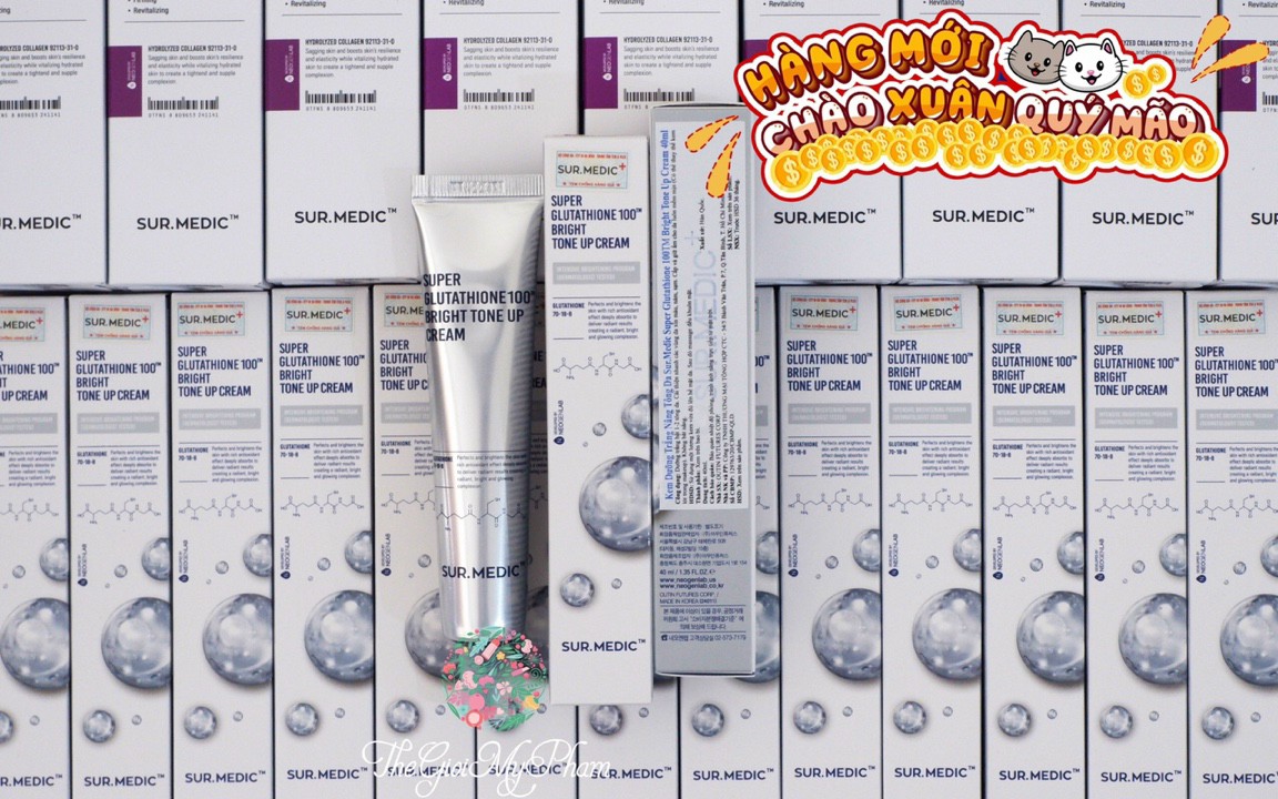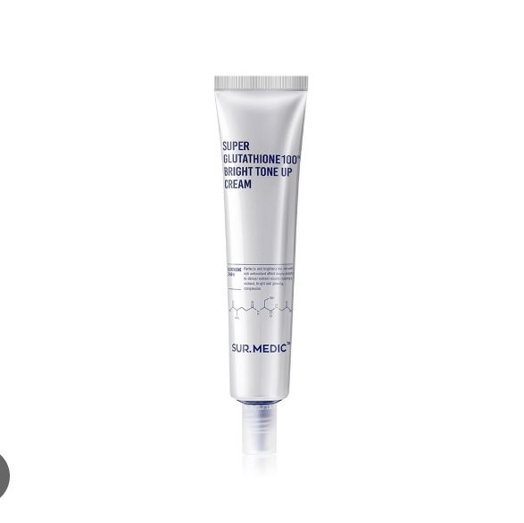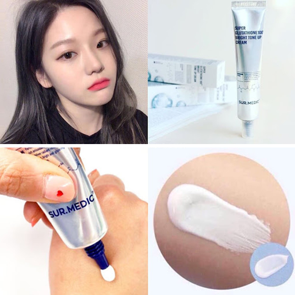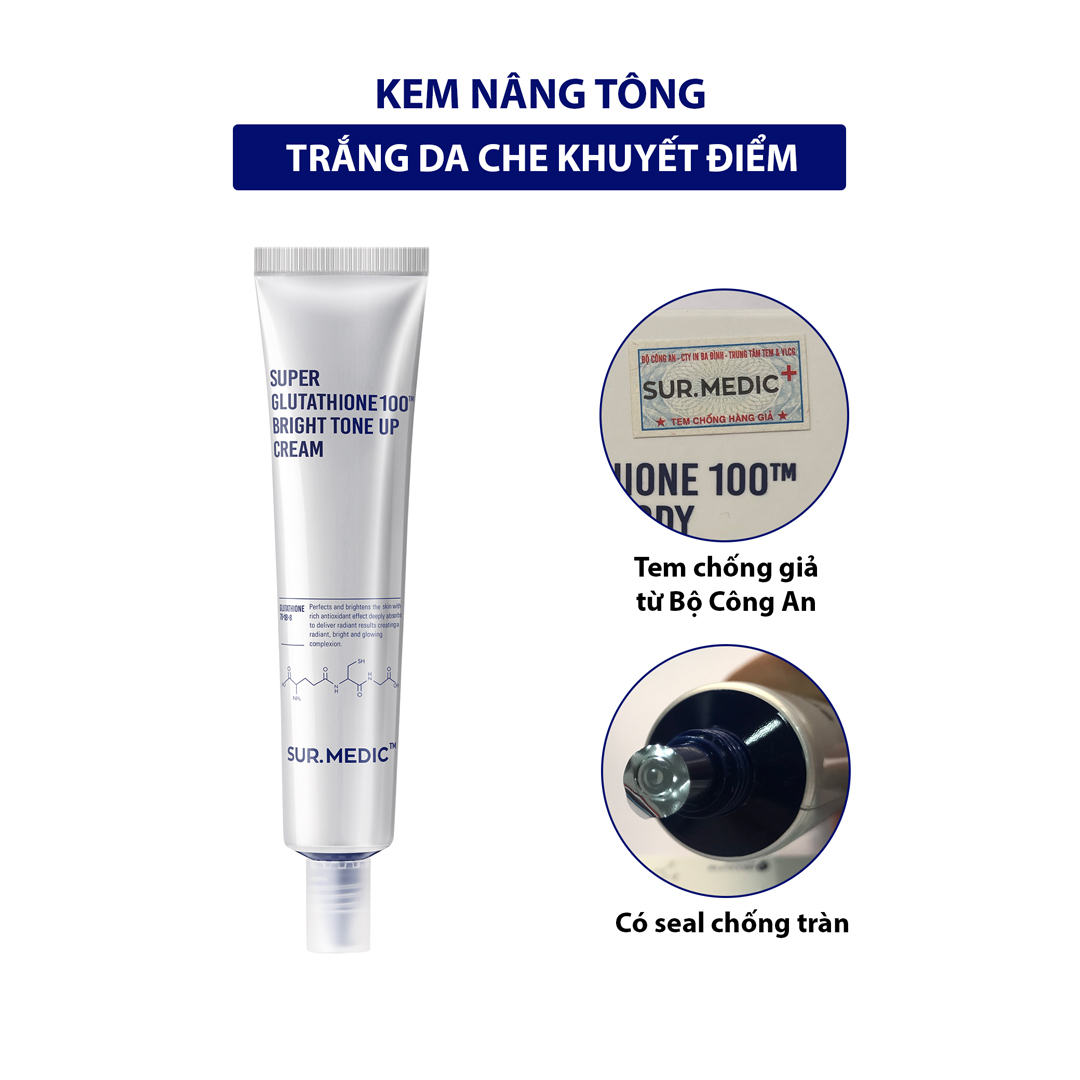 Kem Dưỡng Sur.Medic+ Nâng Tông & Làm Sáng Da Super Glutathione 100 Bright Tone Up Cream là kem dưỡng nâng tông với thành phần Glutathione dồi dào dưỡng da trắng sáng, làm giảm các sắc tố melanin nguyên nhân xuất hiện các dấu hiệu thâm sạm, nám, tàn nhang, cung cấp collagen thiết yếu giúp da săn chắc, mịn màng, ngăn ngừa nếp nhăn và làm trẻ hóa làn da.
