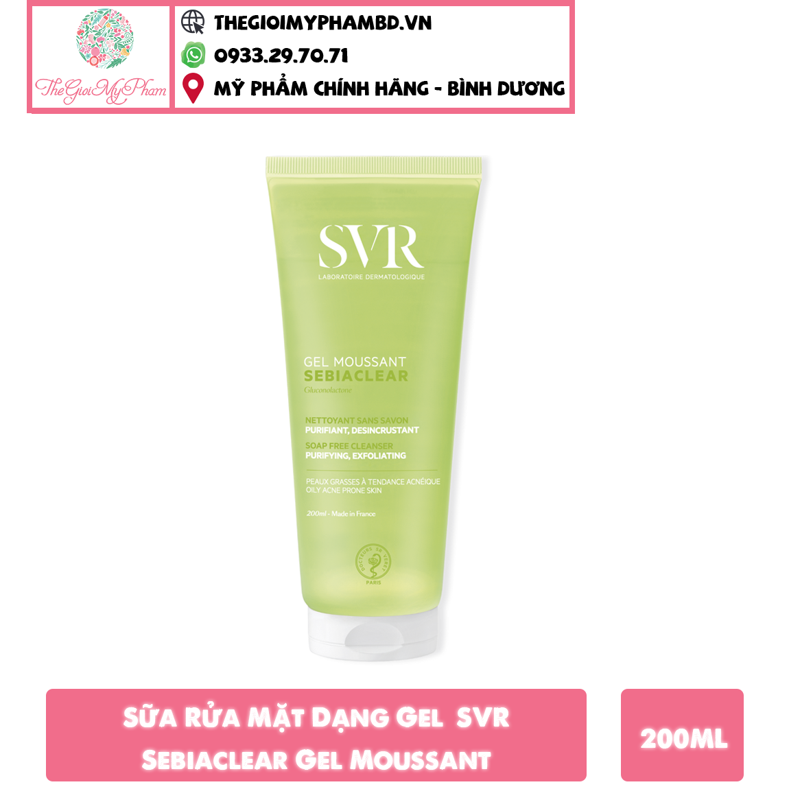 Gel Rửa Mặt SVR Sebiaclear Gel Moussant là sản phẩm sữa rửa mặt dành cho làn da dầu mụn đến từ thương hiệu dược mỹ phẩm SVR, với công thức không chứa xà phòng giúp làm sạch, nhẹ nhàng làm thông thoáng làn da. Khả năng tạo bọt mịn giúp loại trừ các chất bẩn và lượng bã nhờn dư thừa mà không làm khô da. Có thể rửa sạch dễ dàng, mang lại một làn da sạch, tươi mát và khô thoáng.