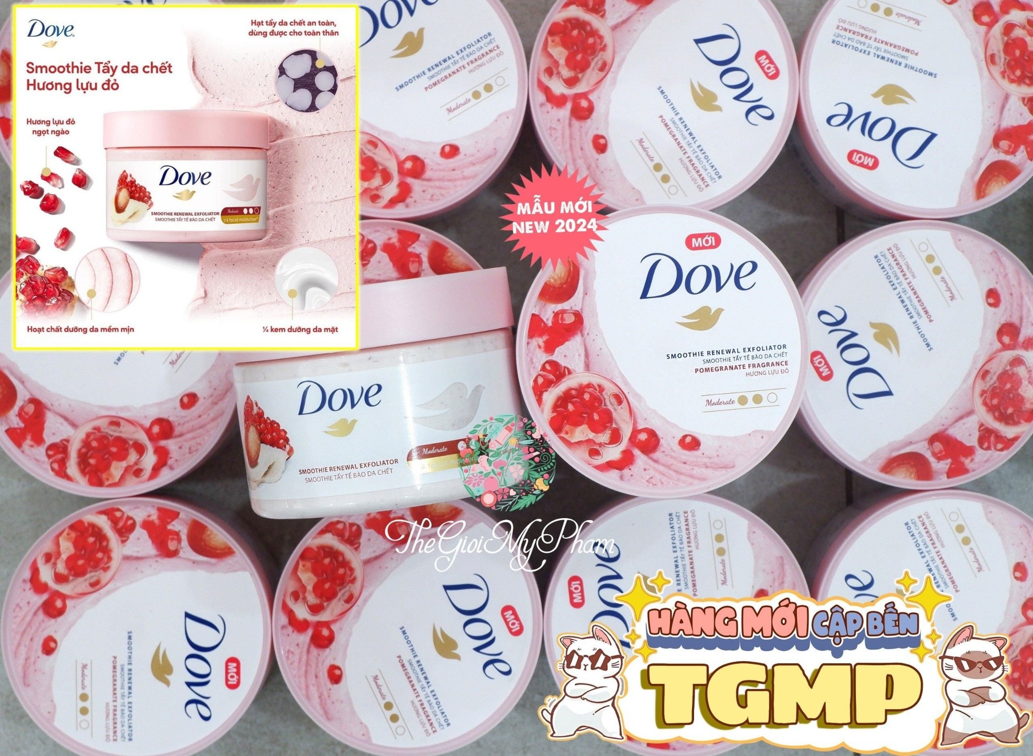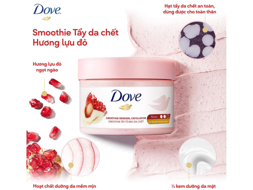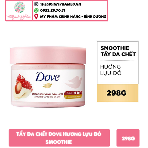Smoothie Tẩy Da Chết Dove hương lựu đỏ50g, 298g: có mức độ tẩy da chết ở mức vừa phải, có thể tẩy sạch mọi vùng da trên cơ thể.