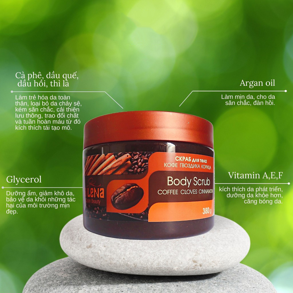 Tẩy da chết quế hồi cà phê Bilena Nga hỗ trợ loại bỏ mụn trên cơ thể, các khuyết điểm da chảy sệ, thiếu săn chắc, đồng thời bổ sung dưỡng chất cho da thêm khỏe mạnh từ bên trong, làm mịn và chống oxy hóa da.