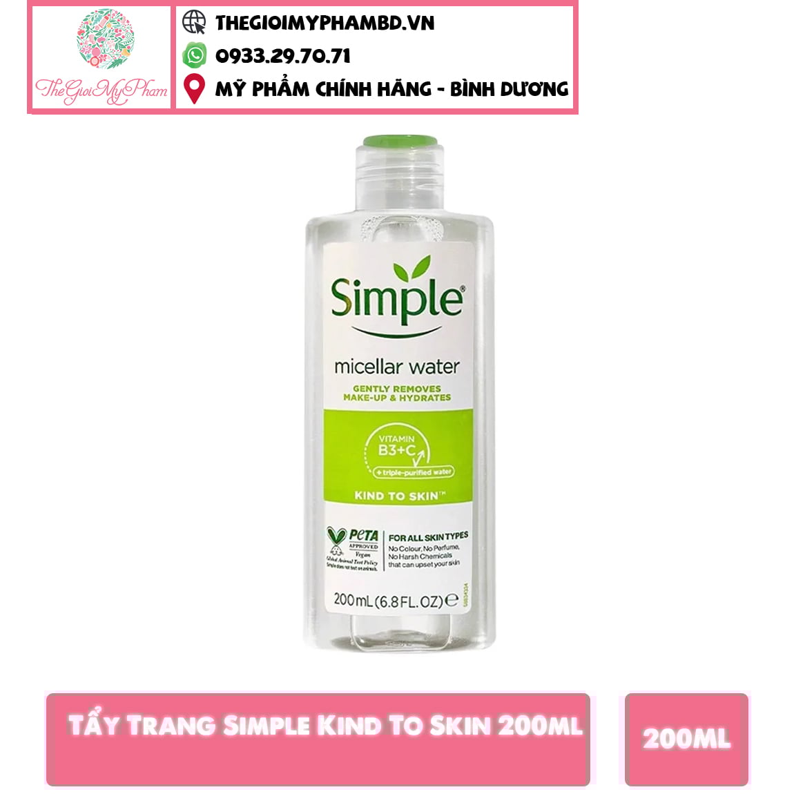 Không hóa chất, paraben, nước hoa nhân tạo hoặc tạo màu, Simple® Micellar Cleansing Water có chứa Vitamin B3 và C, và nước tinh khiết, giúp loại bỏ các bụi bẩn trên da, giúp lỗ chân lông thông thoáng.