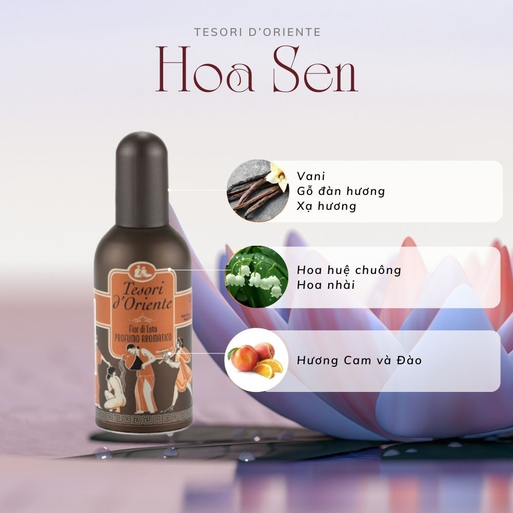 Nước hoa Hương Hoa Sen Tesori D`oriente Lotus Flower And Acacia'S Milk là sự kết hợp của các mùi hương cam, đào, hoa nhài, hoa huệ chuông, vani, gỗ đàn hương và xạ hương.
