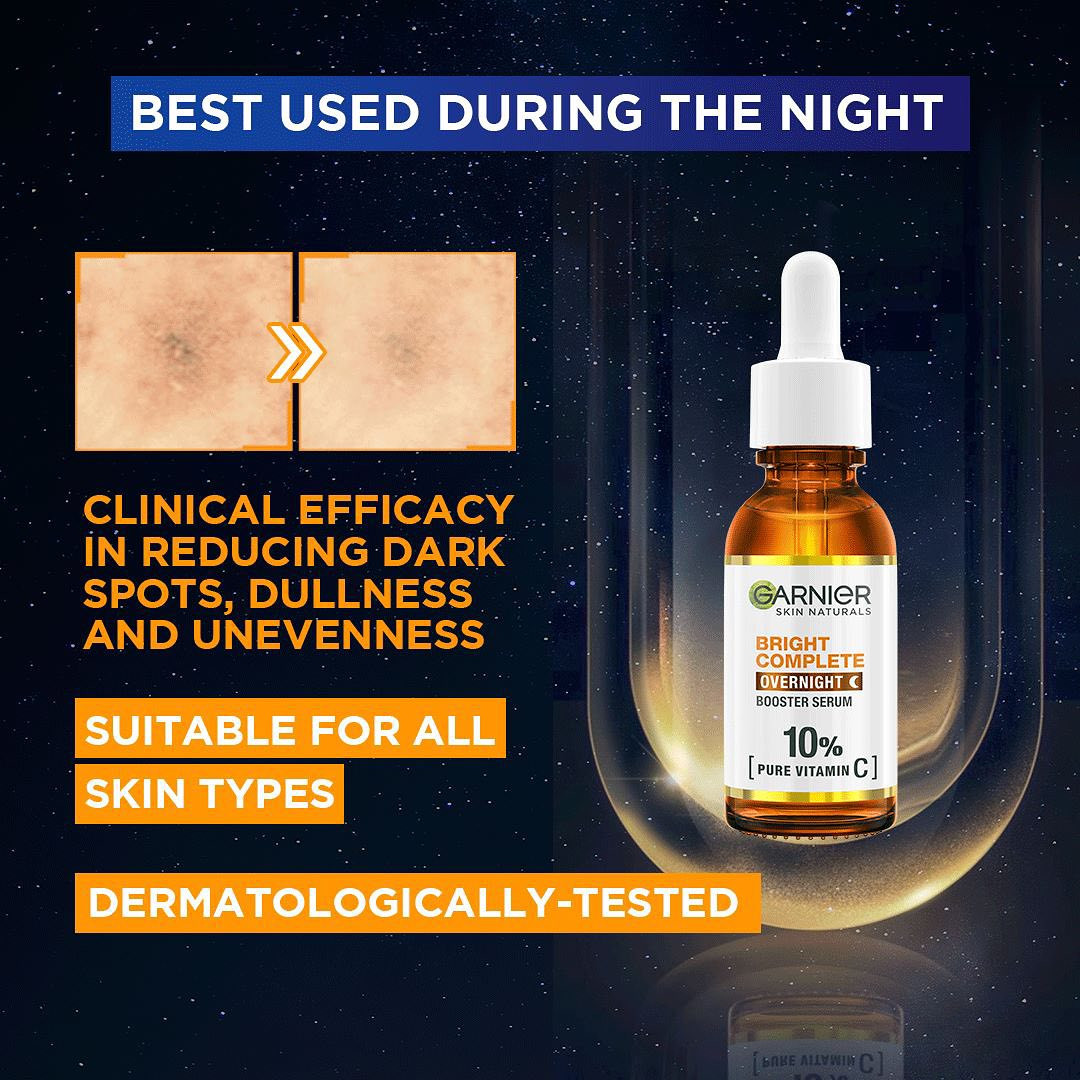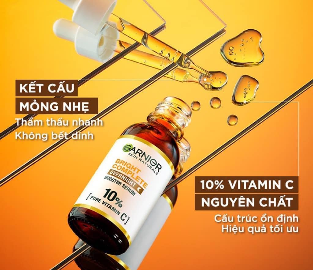 Tinh Chất Tăng Cường Sáng Da Mờ Thâm Ban Đêm Garnier Bright Complete Overnight Booster Serum với công thức đậm đặc chứa 10% Vitamin C có nguồn gốc tự nhiên và Axit Hyaluronic để thúc đẩy quá trình tái tạo da trong khi bạn ngủ.