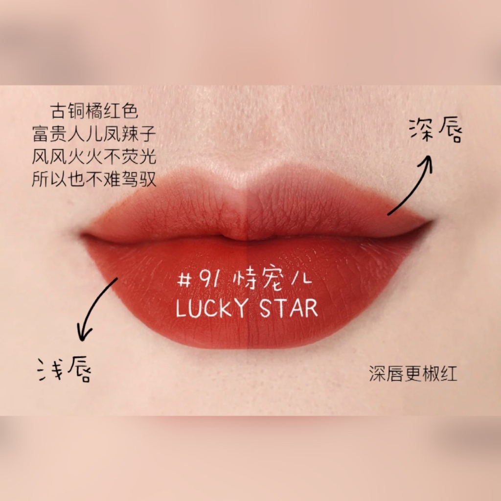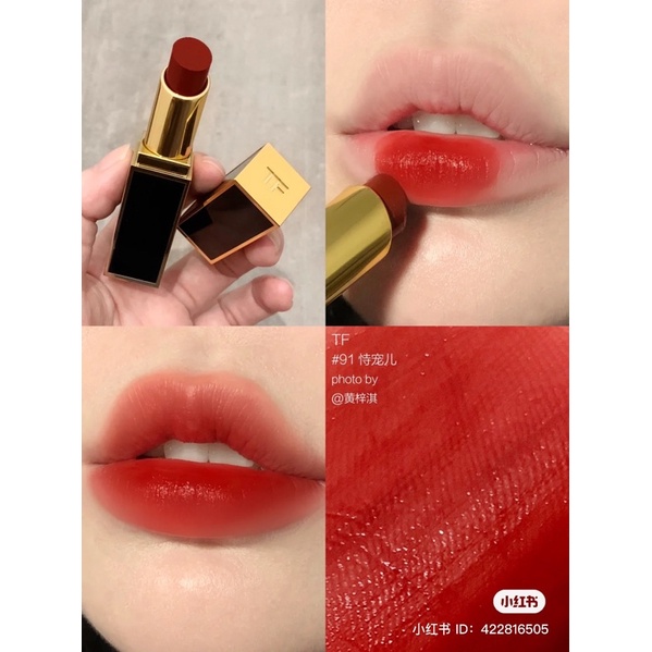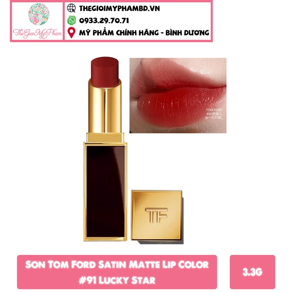- Son Tom Ford Lip Color Satin Matte 91 Lucky Star tone màu đỏ cam gạch cực quyến rũ và siêu tôn da thuộc BST vừa ra mắt năm nay hứa hẹn sẽ có được lòng phái đẹp. Tom Ford 91 là sự kết hợp hoàn hảo giữa chất son satin mềm mịn và dạng son lì nên các Nàng sẽ cảm nhận được ngay chất con mềm mướt khi lên môi nè.