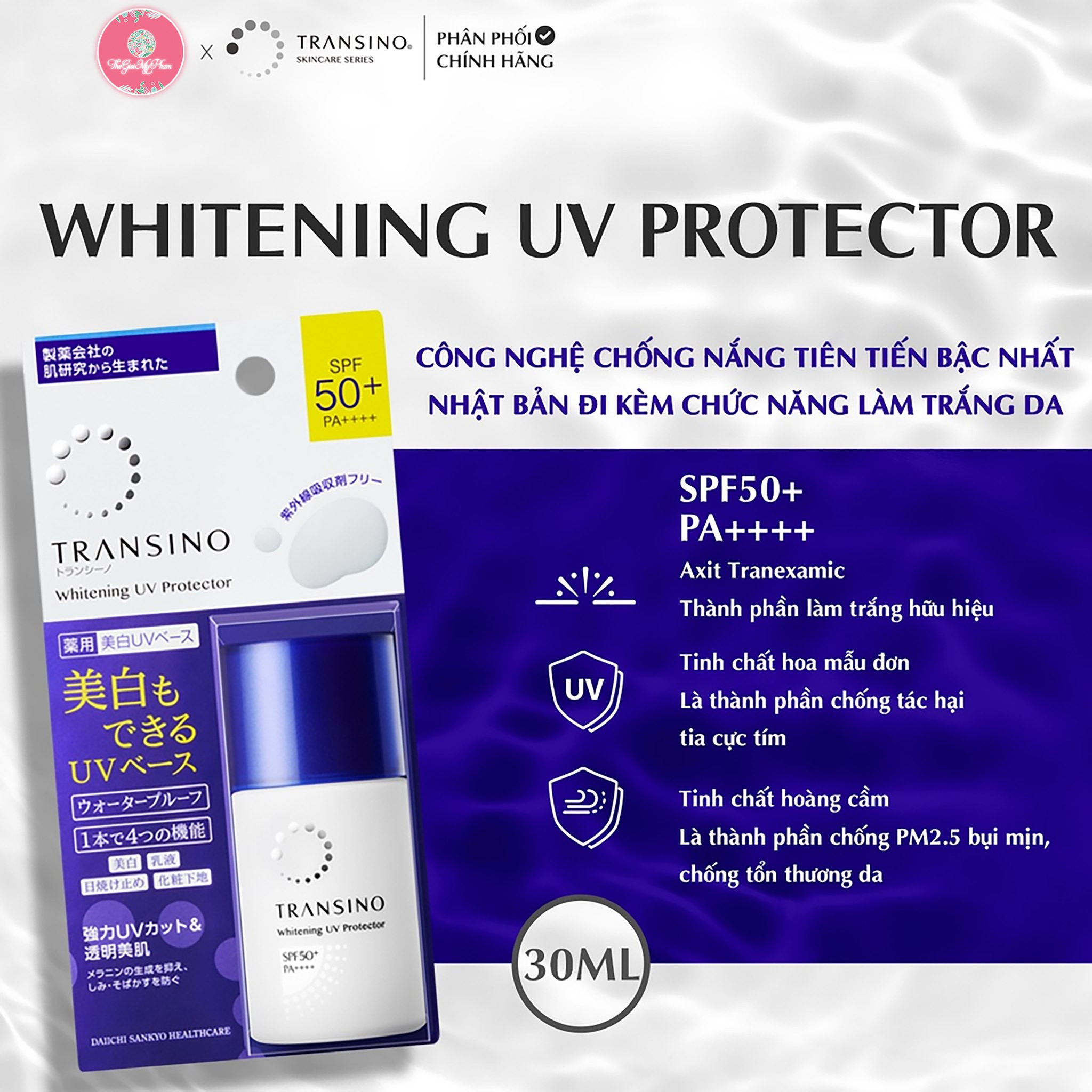 Transino - Kem Chống Nắng UV Protector SPF50+ PA++++ mẫu mới cải tiến mới với chỉ số chống nắng lên đến SPF50+PA++++, là sản phẩm cao cấp của Nhật Bản với các công dụng chính: chống nắng, chống tia cực tím, trắng da & bảo vệ da khỏi sự tác động của tia UV.