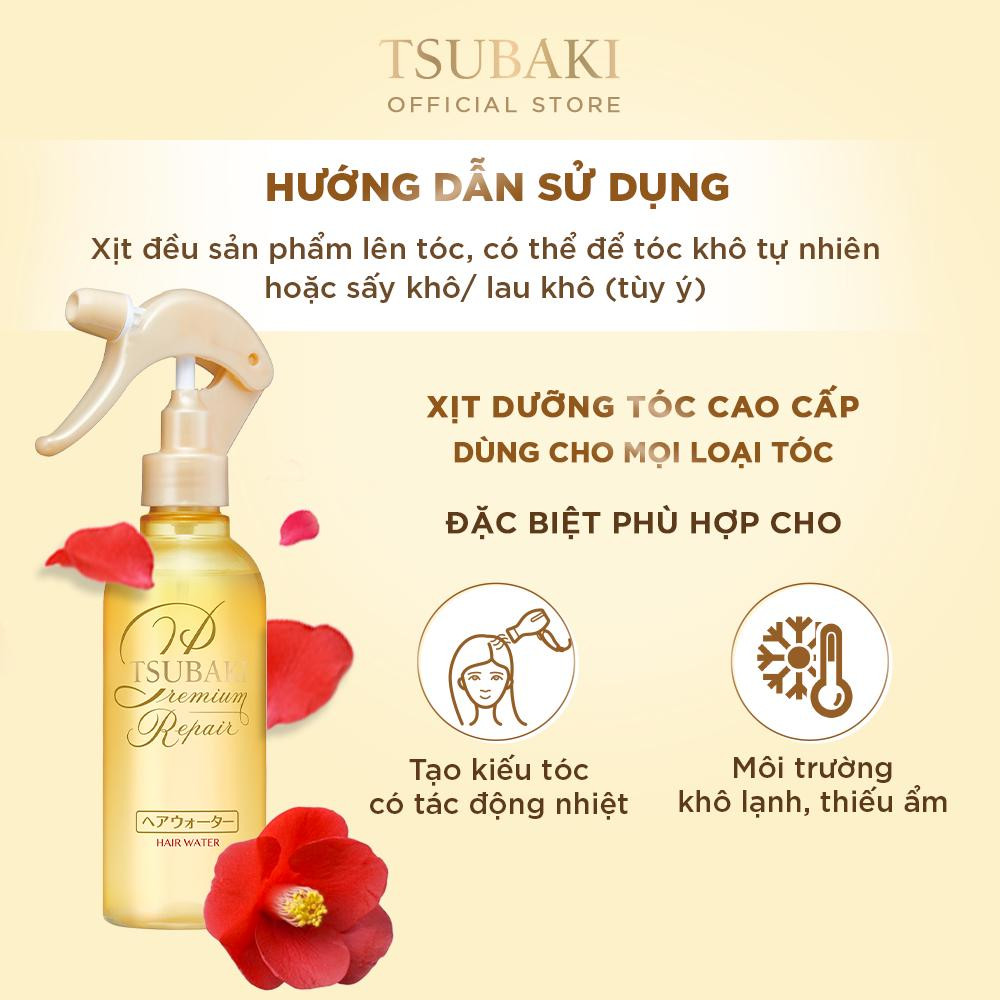 Xịt Dưỡng Tóc Ngăn Ngừa Rụng Tóc TSUBAKI Premium Premium Repair Water là dòng sản phẩm chăm sóc tóc cao cấp mới ra mắt từ thương hiệu chăm sóc tóc TSUBAKI nổi tiếng của Nhật Bản (thuộc tập đoàn Shiseido), giúp giữ cho mái tóc khỏe đẹp với chức năng khóa ẩm và ngăn chặn tia UV. Bảo vệ mái tóc khỏi khô, xơ dưới nhiệt độ của máy sấy tóc. Sản phẩm không chứa chất bảo quản, an toàn cho da đầu và sức khỏe.