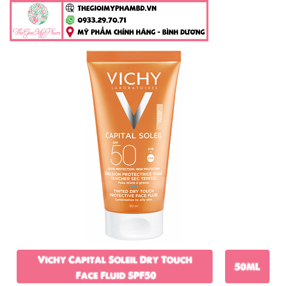 Kem Chống Nắng Kiểm Soát Dầu, Không Nhờn Rít Vichy Capital Soleil Dry Touch Face Fluid là kem chống nắng không màu Vichy Ideal Soleil là chống nắng hoàn toàn không bóng nhờn với 4 màng lọc giúp bảo vệ da hoàn hảo trước tác hại của các tia cực tím độc hại UVA/UVB và chứa 2 thành phần giúp mang lại cảm giác khô ráo và không bóng dầu.