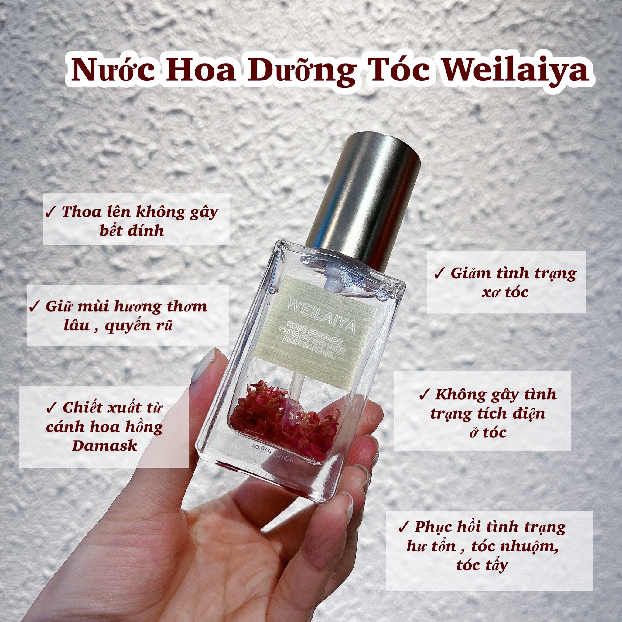 Nước hoa dưỡng tóc Weilaiya sở hữu tinh chất hoa hồng Damask (RẤT RẤT HIẾM CÁC LOẠI DẦU DƯỠNG TÓC CÓ TINH CHẤT NÀY vì nó thật sự đắt đỏ) có khả năng hô biến ngay lập tức mái tóc mềm ngay lập tức, bóng sáng.