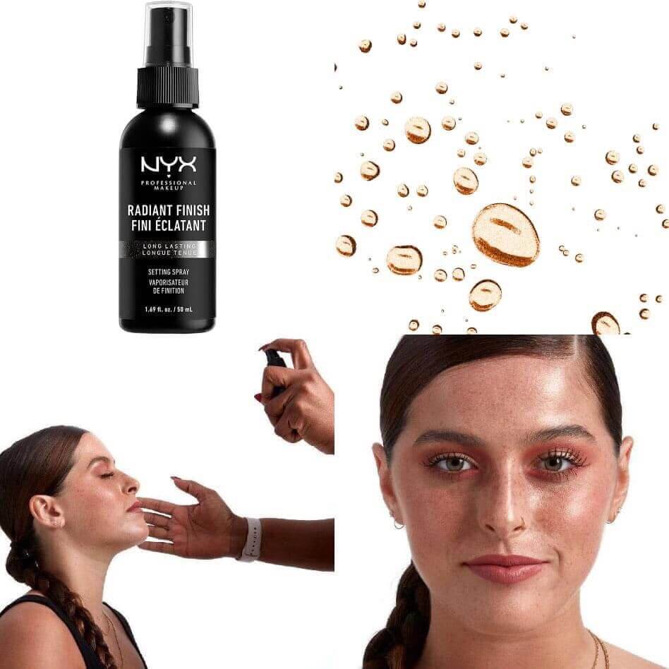 #NYX RADIANT Finish Setting Spray (Đen): là dòng sản phẩm mới, được pha trộn từ những viên ngọc siêu mịn trong sắc vàng óng ánh, làm cho gương mặt bạn thêm sáng bừng, rạng rỡ, hỗ trợ kiềm dầu và giúp lớp nền lì hơn suốt cả ngày.