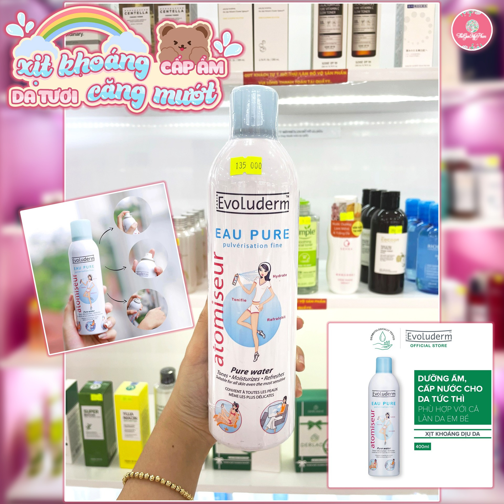 Không chỉ có tác dụng cung cấp nước và độ ẩm, chị em còn có thể nhanh chóng lấy lại sự tỉnh táo bằng cách sử dụng Xịt khoáng Evoluderm cho vùng mắt. Do là nước tinh khiết nên xịt khoáng không gây cay mắt hay kích ứng gì cho vùng da nhạy cảm này.